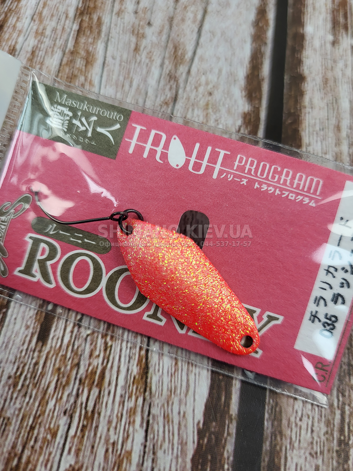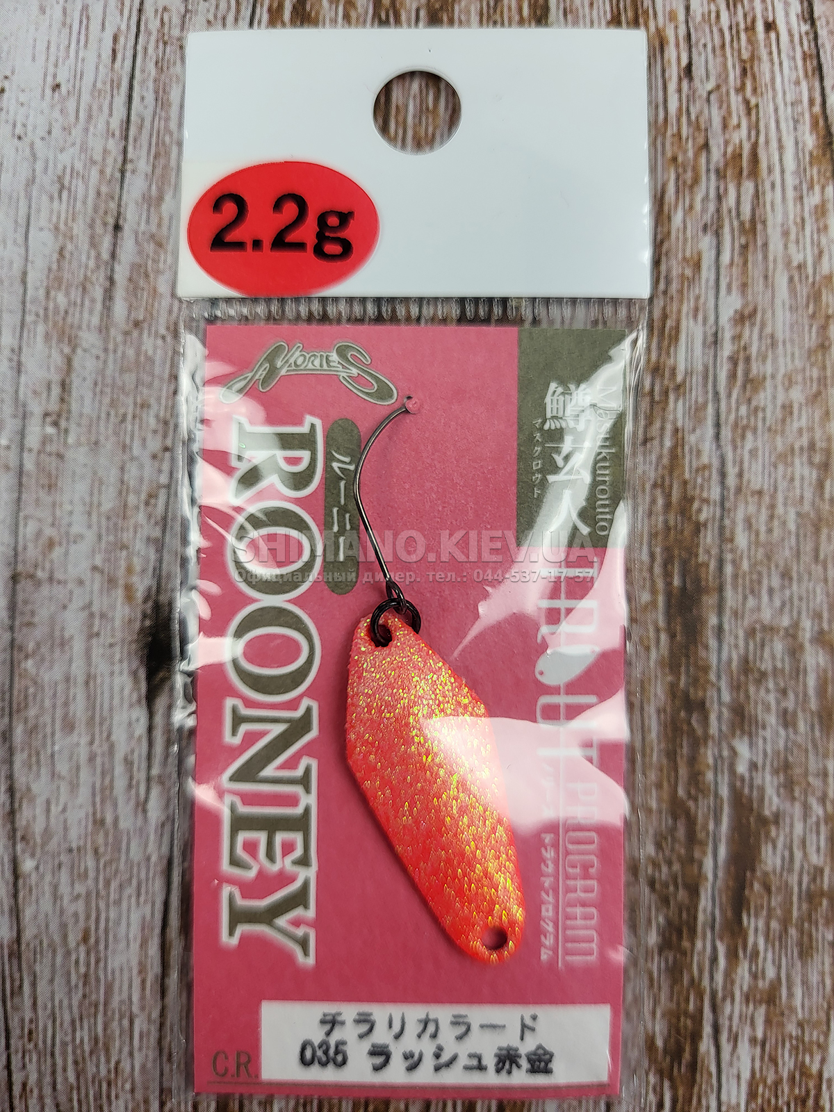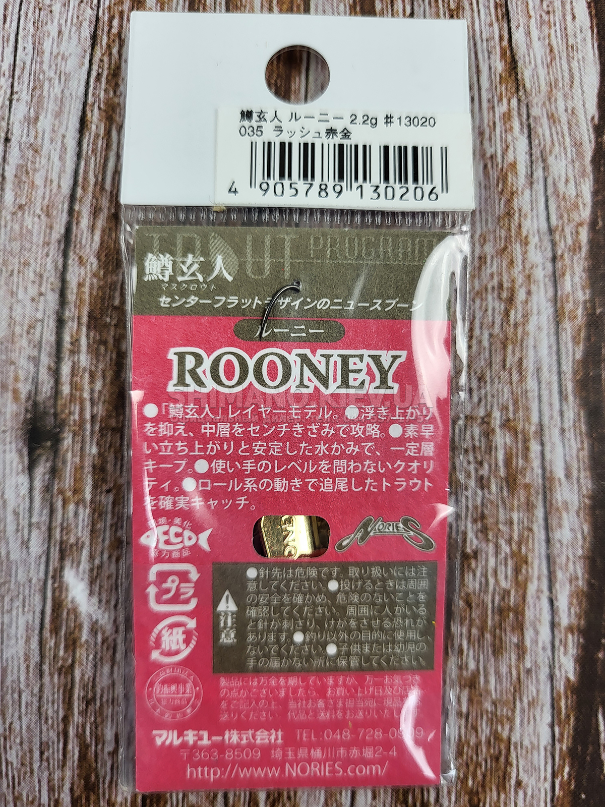 Блешня Nories Masukurouto Rooney– розроблена під керівництвом експерта Норіо Танабе після ретельного тестування в ставках з фореллю. Збалансована форма і маса дозволяють здійснювати дальній кидок навіть в умовах зустрічного вітру. Різні маси блешень володіють своїми власними технічними характеристиками - вигин, форма, товщина металу. Головною особливістю є ретельно розрахований центр тяжіння, який створює стабільні і різкі коливання. Серія Rooney має більш високочастотну гру у порівнянні з Weeper. А звичайна серія втілює в собі золоту середину характеристик частоти коливань. Система фарбування, з різними кольорами на звороті блешні візуально стимулює форель. Блешня Nories Masukurouto Rooney оснащена безбородим одинарним гачком.