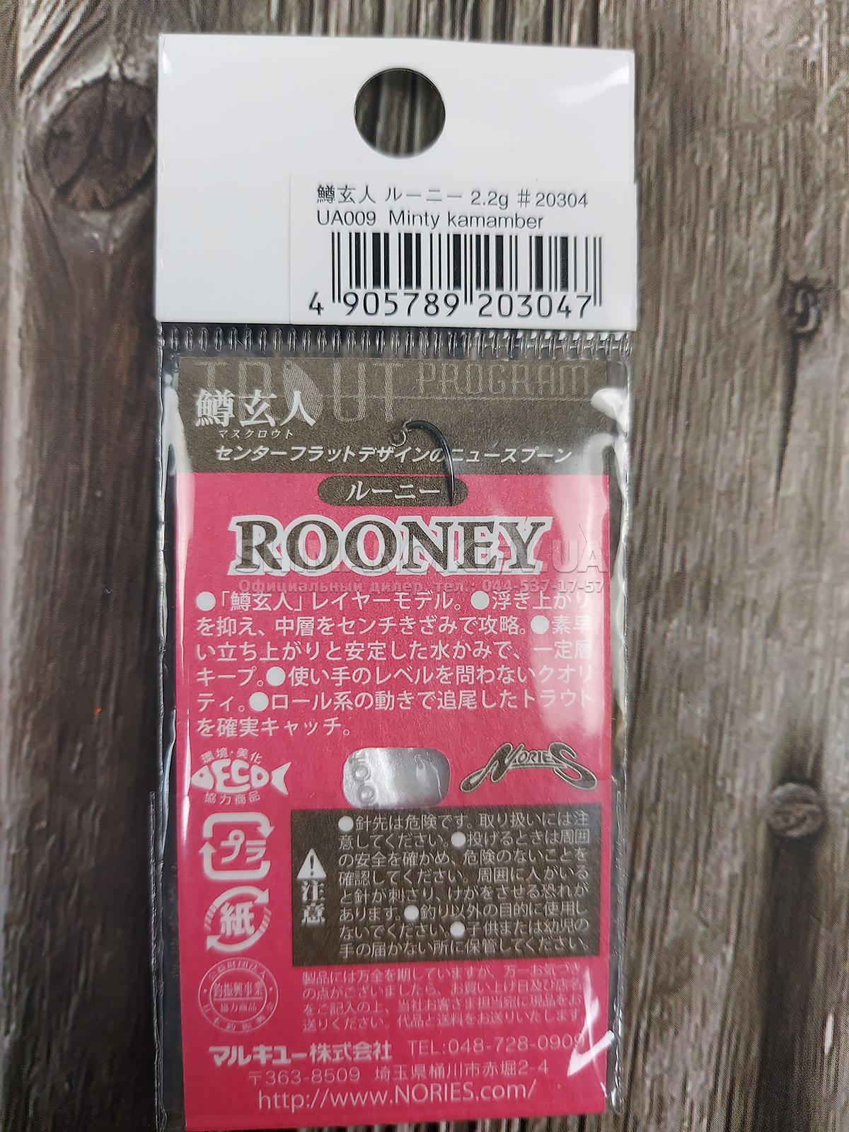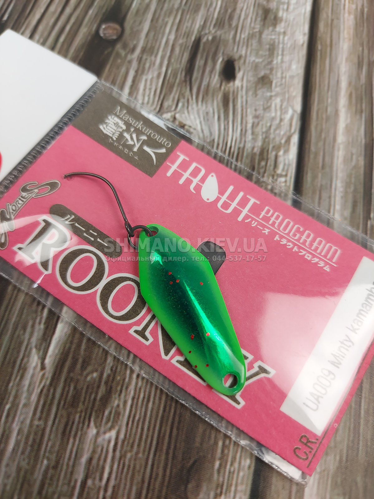 Блешня Nories Masukurouto Rooney– розроблена під керівництвом експерта Норіо Танабе після ретельного тестування в ставках з фореллю. Збалансована форма і маса дозволяють здійснювати дальній кидок навіть в умовах зустрічного вітру. Різні маси блешень володіють своїми власними технічними характеристиками - вигин, форма, товщина металу. Головною особливістю є ретельно розрахований центр тяжіння, який створює стабільні і різкі коливання. Серія Rooney має більш високочастотну гру у порівнянні з Weeper. А звичайна серія втілює в собі золоту середину характеристик частоти коливань. Система фарбування, з різними кольорами на звороті блешні візуально стимулює форель. Блешня Nories Masukurouto Rooney оснащена безбородим одинарним гачком.