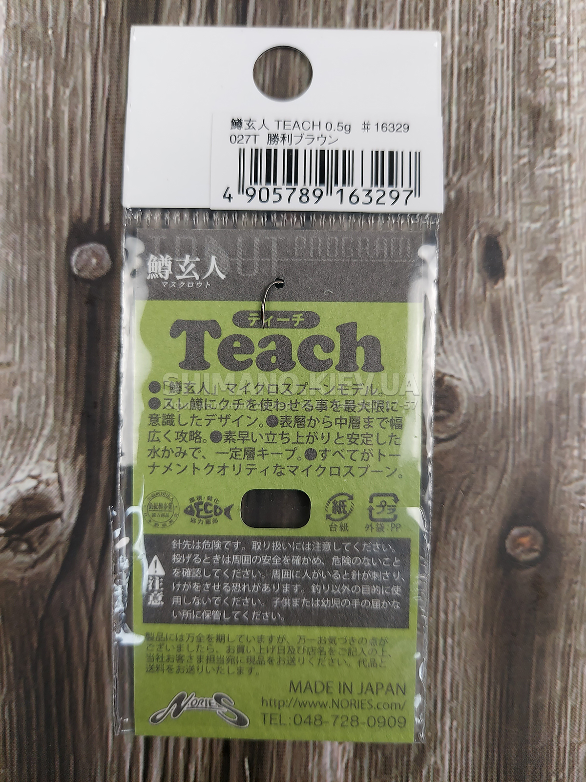 Блешня Nories Masukurouto Teach - невелика коливалка, областю застосування якої є горизонт проводки до 1 метра під поверхнею. Компактний розмір і форма мінімізують звук і хвилю при коливанні і приводнюванні блешні, що дозволяє виконувати точкові закидання прямо рибі під самий ніс. Модель з такими параметрами застосовується в разі, коли риба дуже полохлива і перестає реагувати на інші приманки. Nories Masukurouto Teach в першу чергу застосовується для лову ставкової форелі, для якої вона і розроблена, але також може показувати непогані результати по окуню і іншій рибі, що попадається на ультралайтові снасті.