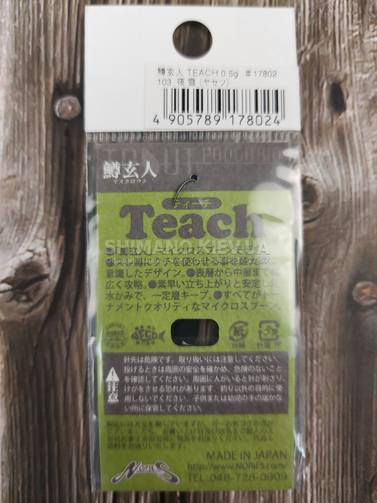 Блешня Nories Masukurouto Teach - невелика коливалка, областю застосування якої є горизонт проводки до 1 метра під поверхнею. Компактний розмір і форма мінімізують звук і хвилю при коливанні і приводнюванні блешні, що дозволяє виконувати точкові закидання прямо рибі під самий ніс. Модель з такими параметрами застосовується в разі, коли риба дуже полохлива і перестає реагувати на інші приманки. Nories Masukurouto Teach в першу чергу застосовується для лову ставкової форелі, для якої вона і розроблена, але також може показувати непогані результати по окуню і іншій рибі, що попадається на ультралайтові снасті.