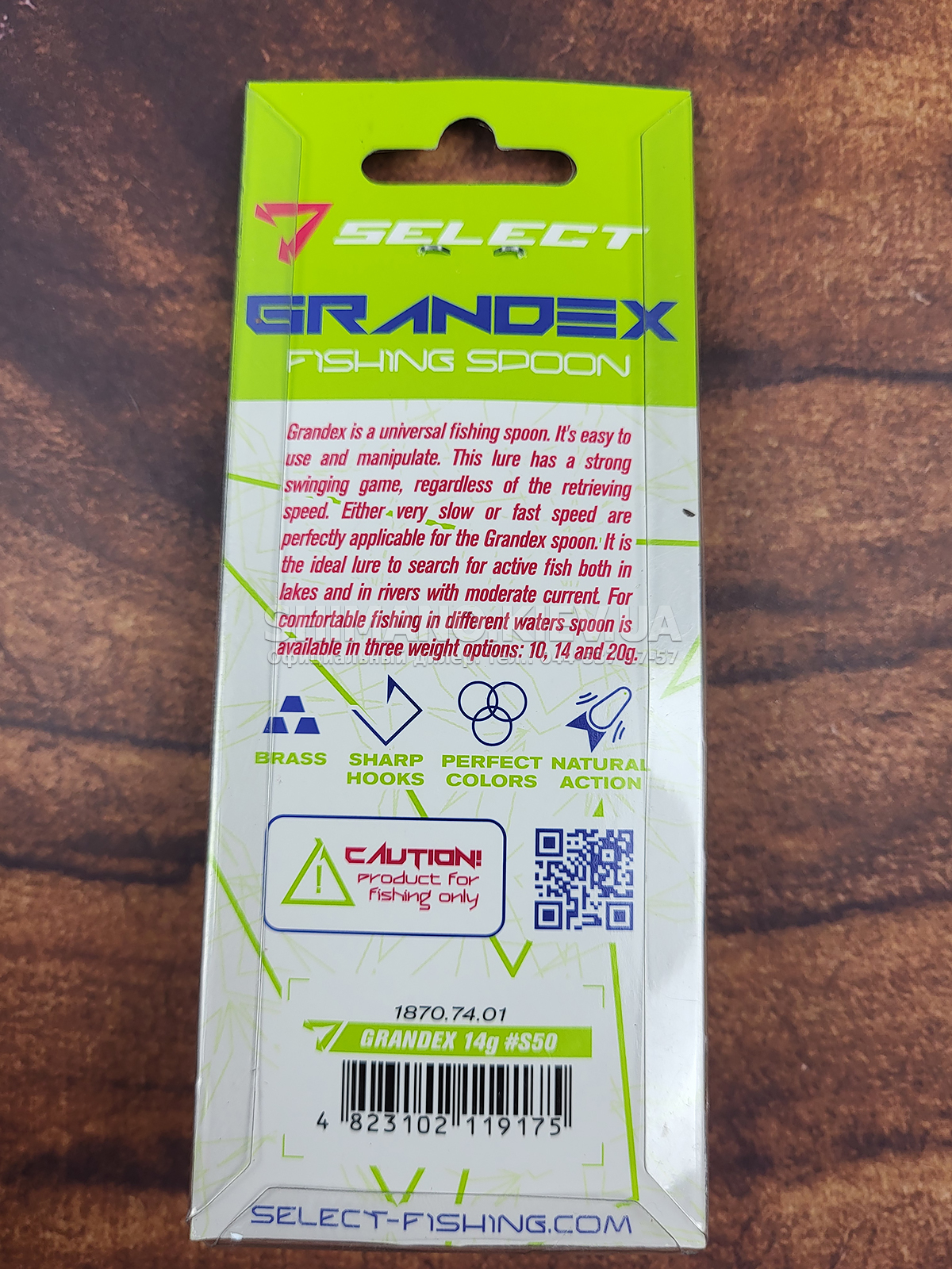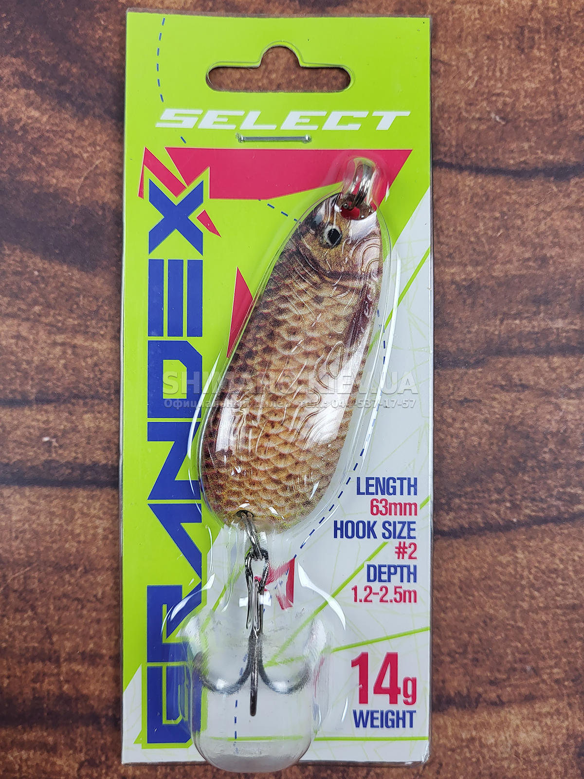Select Grandex — універсальна блешня-коливалка, створена для результативного лову щуки, окуня та іншого хижого хижого виду. Вона проста у використанні, має стабільну та виразну гру, яка зберігається навіть при зміні швидкості проводки.