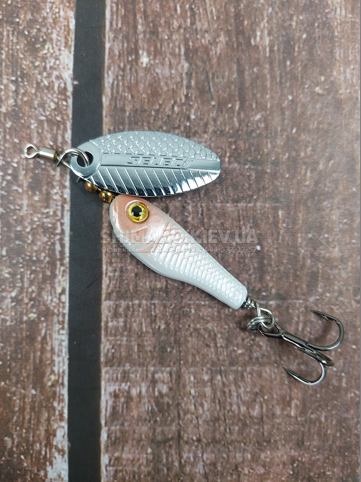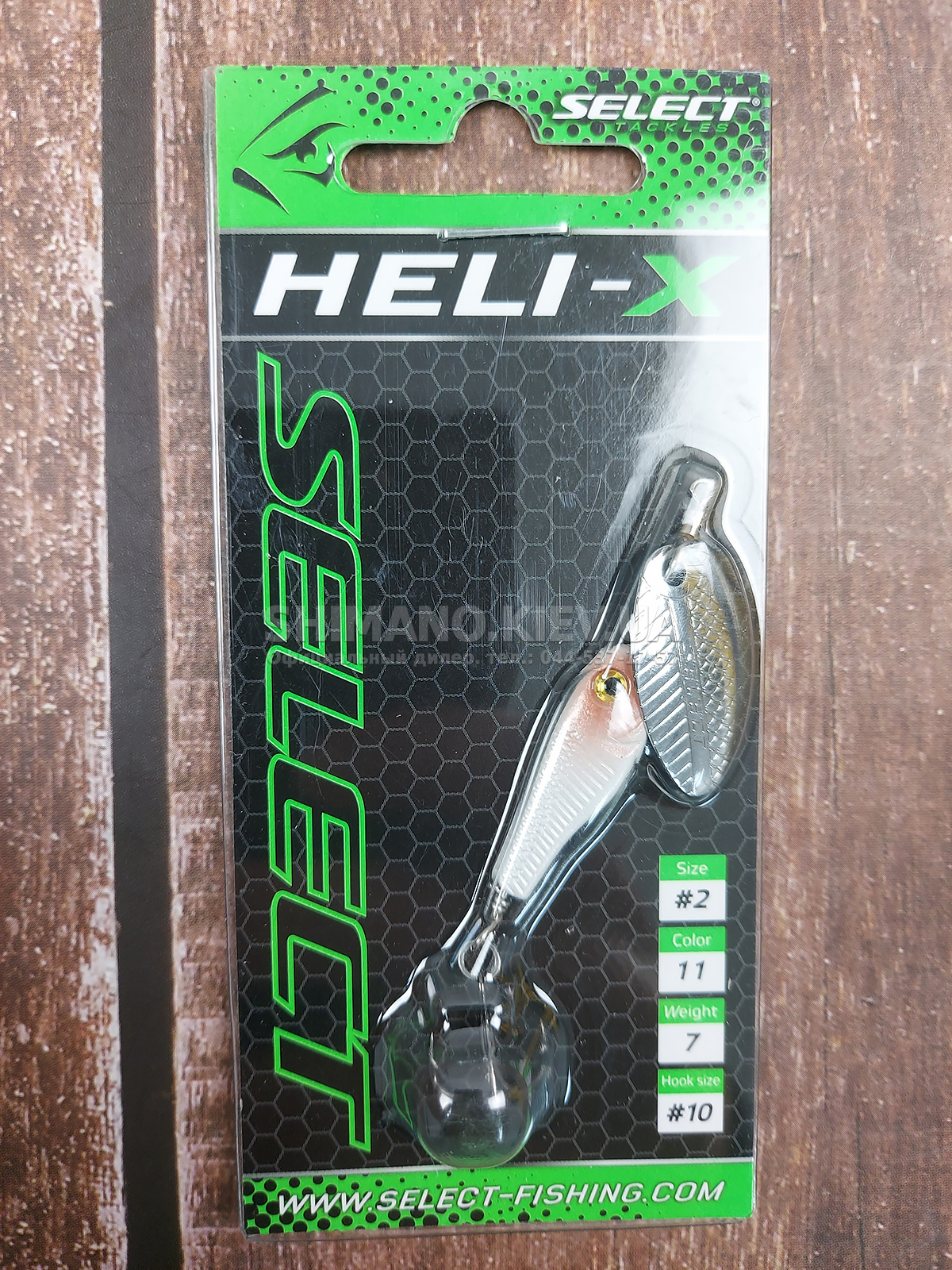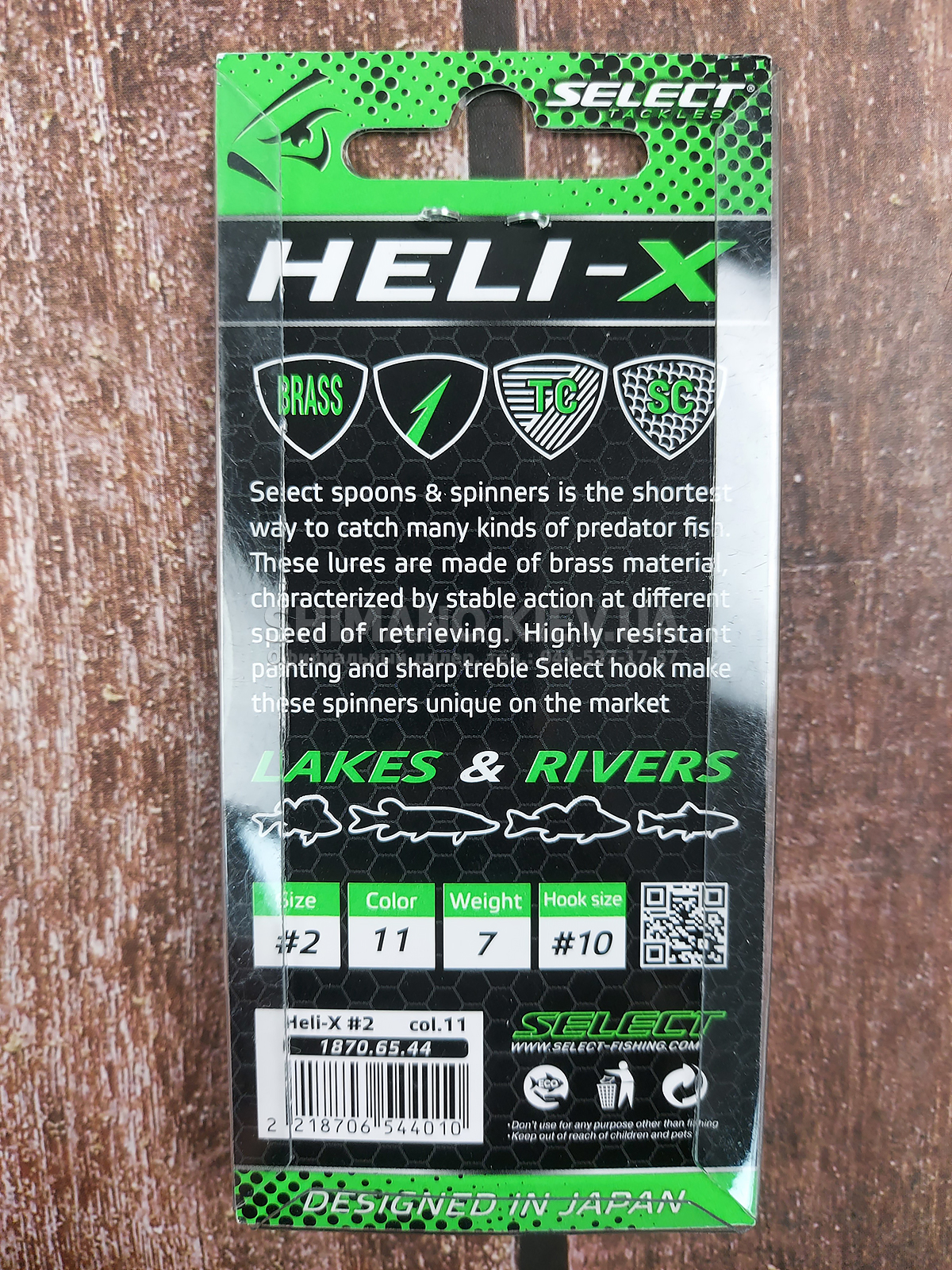Блешня Select Heli-X - досконала оберталка для риболовлі на течії. Осердя зроблено у формі малька, воно виготовлене з важкого металу і має асиметричну форму. Завдяки цьому приманка добре тримає течію і її можна закинути досить далеко. Замість передньої петлі на вісі блешні вмонтований вертлюжок, який разом з асиметричним сердечником максимально зменшує закручування шнура під час риболовлі. Пелюстка має рельєфну текстуру у вигляді луски риби, що створює у воді додаткові привабливі відблиски. Конструкція цієї вертушки дозволяє використовувати її не тільки на течії. Heli-X швидко включається у роботу навіть у стоячій воді, та навіть більше, її можна проводити на досить повільній швидкості, що дуже подобається пасивному хижакові. Основні трофеї цієї блешні: окунь, щука, головень, жерех і в`язь, а також форель і харіус, якщо вони є у водоймі. Select Heli-X доступний у 5-ти розмірах – від 3 до 14г, тому підійде під снасті різної потужності.