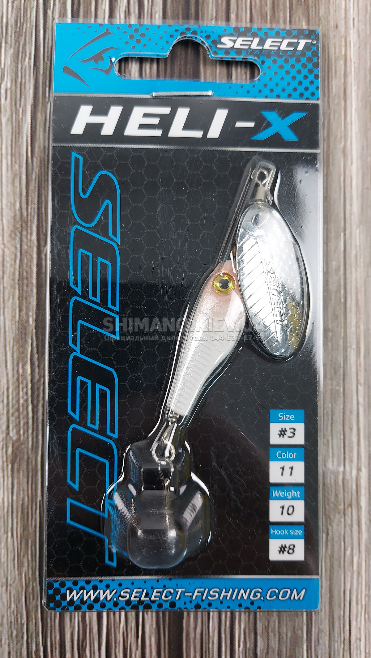 Блешня Select Heli-X - досконала оберталка для риболовлі на течії. Осердя зроблено у формі малька, воно виготовлене з важкого металу і має асиметричну форму. Завдяки цьому приманка добре тримає течію і її можна закинути досить далеко. Замість передньої петлі на вісі блешні вмонтований вертлюжок, який разом з асиметричним сердечником максимально зменшує закручування шнура під час риболовлі. Пелюстка має рельєфну текстуру у вигляді луски риби, що створює у воді додаткові привабливі відблиски. Конструкція цієї вертушки дозволяє використовувати її не тільки на течії. Heli-X швидко включається у роботу навіть у стоячій воді, та навіть більше, її можна проводити на досить повільній швидкості, що дуже подобається пасивному хижакові. Основні трофеї цієї блешні: окунь, щука, головень, жерех і в`язь, а також форель і харіус, якщо вони є у водоймі. Select Heli-X доступний у 5-ти розмірах – від 3 до 14г, тому підійде під снасті різної потужності.