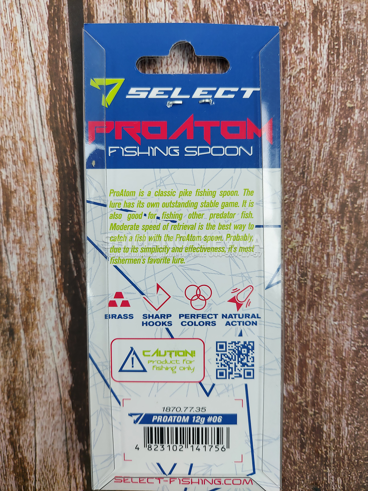 Блешня Select ProAtom - коливалка дуже популярної форми, яка часто використовується для лову щуки. Завдяки своїй унікальній власній грі на рівномірній проводці вона добре ловить не тільки "зубасту", але й іншу хижу рибу. Для того, щоб досягти успіху, достатньо проводити блешню в середньому темпі, при цьому вона стабільно приноситиме результат. Хоча доповнення пауз та різних ривків допоможуть привнести різноманітність у гру та збільшити кількість клювань.Блешня Select ProAtom випускається в декількох розмірах для риболовлі на різних глибинах.