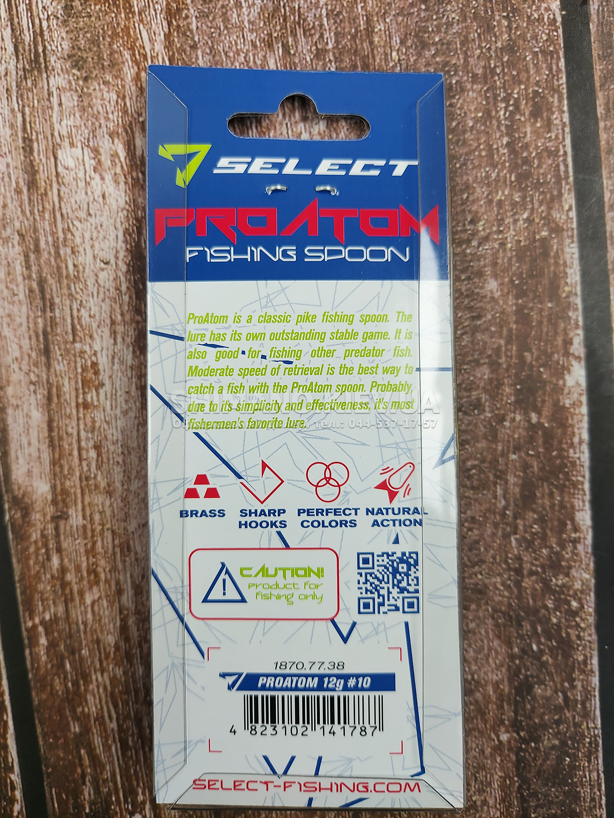 Блешня Select ProAtom - коливалка дуже популярної форми, яка часто використовується для лову щуки. Завдяки своїй унікальній власній грі на рівномірній проводці вона добре ловить не тільки "зубасту", але й іншу хижу рибу. Для того, щоб досягти успіху, достатньо проводити блешню в середньому темпі, при цьому вона стабільно приноситиме результат. Хоча доповнення пауз та різних ривків допоможуть привнести різноманітність у гру та збільшити кількість клювань.Блешня Select ProAtom випускається в декількох розмірах для риболовлі на різних глибинах.