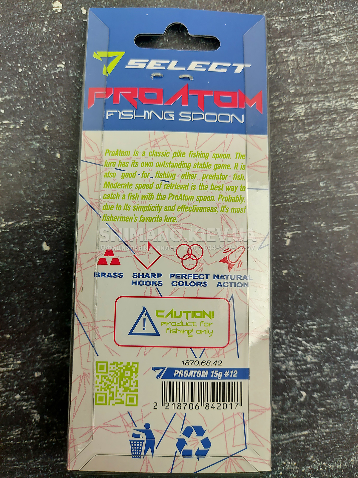 Блешня Select ProAtom - коливалка дуже популярної форми, яка часто використовується для лову щуки. Завдяки своїй унікальній власній грі на рівномірній проводці вона добре ловить не тільки "зубасту", але й іншу хижу рибу. Для того, щоб досягти успіху, достатньо проводити блешню в середньому темпі, при цьому вона стабільно приноситиме результат. Хоча доповнення пауз та різних ривків допоможуть привнести різноманітність у гру та збільшити кількість клювань.Блешня Select ProAtom випускається в декількох розмірах для риболовлі на різних глибинах