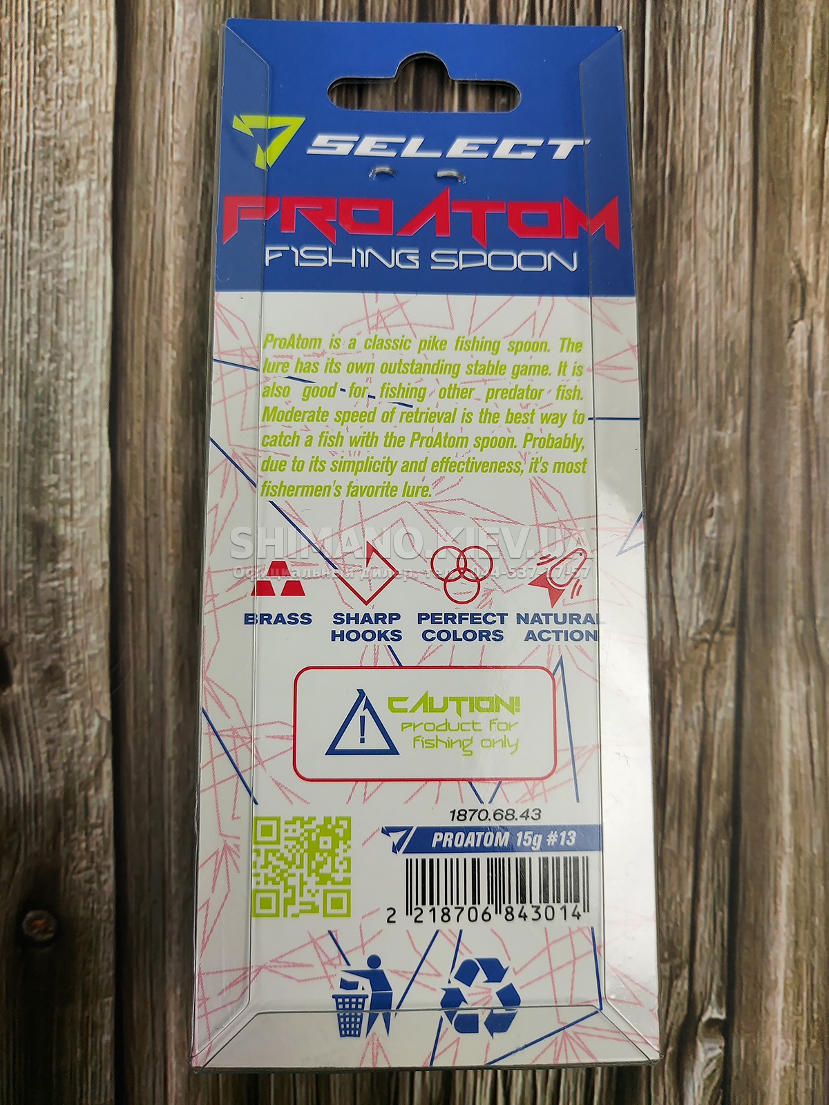 Блешня Select ProAtom - коливалка дуже популярної форми, яка часто використовується для лову щуки. Завдяки своїй унікальній власній грі на рівномірній проводці вона добре ловить не тільки "зубасту", але й іншу хижу рибу. Для того, щоб досягти успіху, достатньо проводити блешню в середньому темпі, при цьому вона стабільно приноситиме результат. Хоча доповнення пауз та різних ривків допоможуть привнести різноманітність у гру та збільшити кількість клювань.