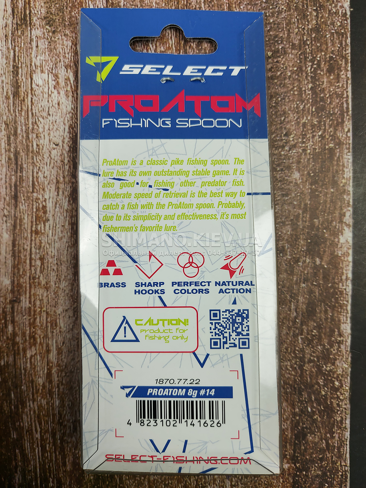 Блешня Select ProAtom - коливалка дуже популярної форми, яка часто використовується для лову щуки. Завдяки своїй унікальній власній грі на рівномірній проводці вона добре ловить не тільки "зубасту", але й іншу хижу рибу. Для того, щоб досягти успіху, достатньо проводити блешню в середньому темпі, при цьому вона стабільно приноситиме результат. Хоча доповнення пауз та різних ривків допоможуть привнести різноманітність у гру та збільшити кількість клювань.Блешня Select ProAtom випускається в декількох розмірах для риболовлі на різних глибинах