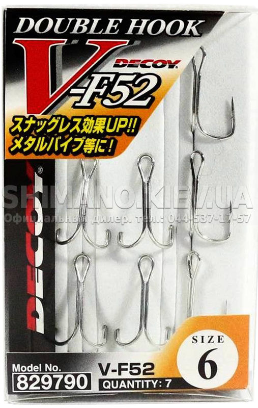 Двійник Decoy Double V-F52 – відмінна альтернатива для заміни трійників на приманках, при лові в місцях, де багато зачепів. Також можуть застосовуватися для оснащення силіконових приманок з коротким тілом. Гачок виконаний з високоякісного металу, що відрізняється підвищеною міцністю при збереженні невеликої маси. Фірмова заточка Decoy у поєднанні з мікроборідкою дозволяють легко і безперешкодно проникати в губу риби, збільшуючи тим самим кількість реалізованих клювань. Двійник Decoy Double V-F52 має спеціальне антикорозійне покриття, що дозволяє використовувати його не тільки для риболовлі в прісних водоймах, але і на морі.