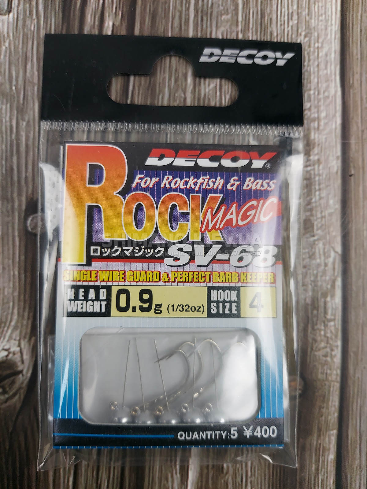 Decoy Rock Magic SV-68 - джиг-головка з антизачепом з еластичного дроту, що має спеціальний стрижень вздовж цівки для найкращої фіксації приманки. Доцільно застосування для лову окуня і невеликої щуки на силіконові приманки різних типів серед вертикальних підводних заростей, затоплених кущів або просто в складних умовах, де оснастки з відкритими гачками будуть постійно чіплятися.