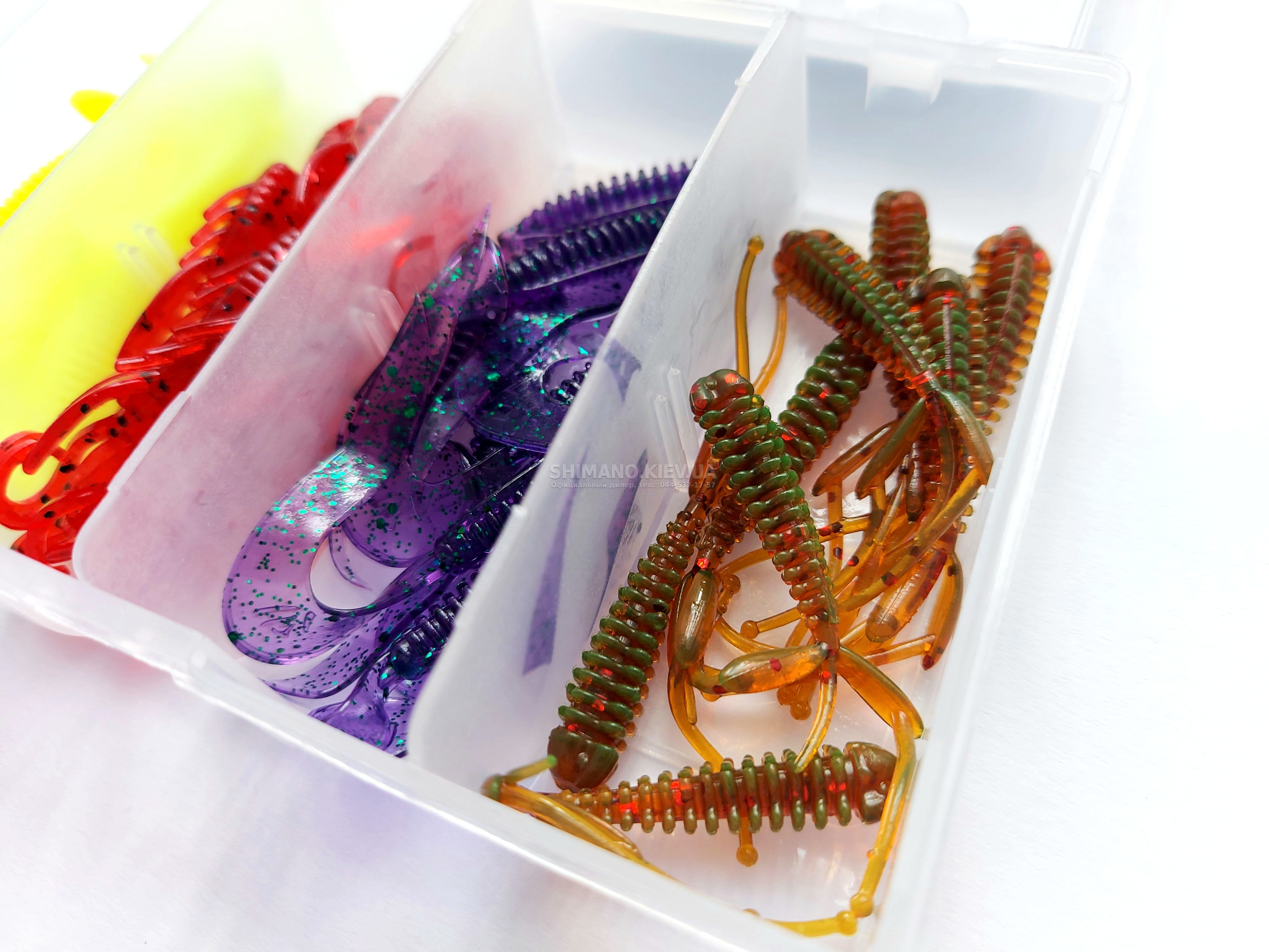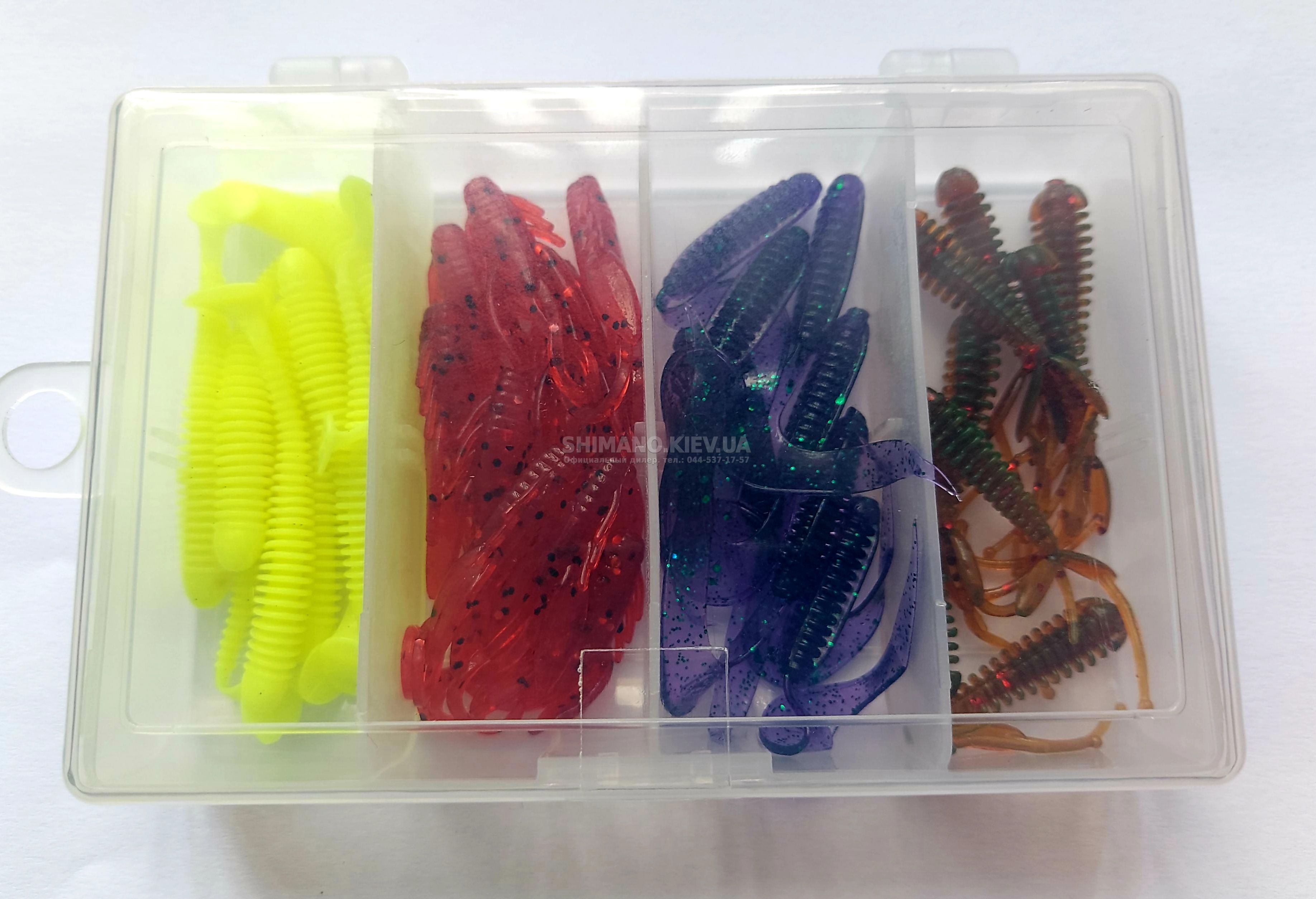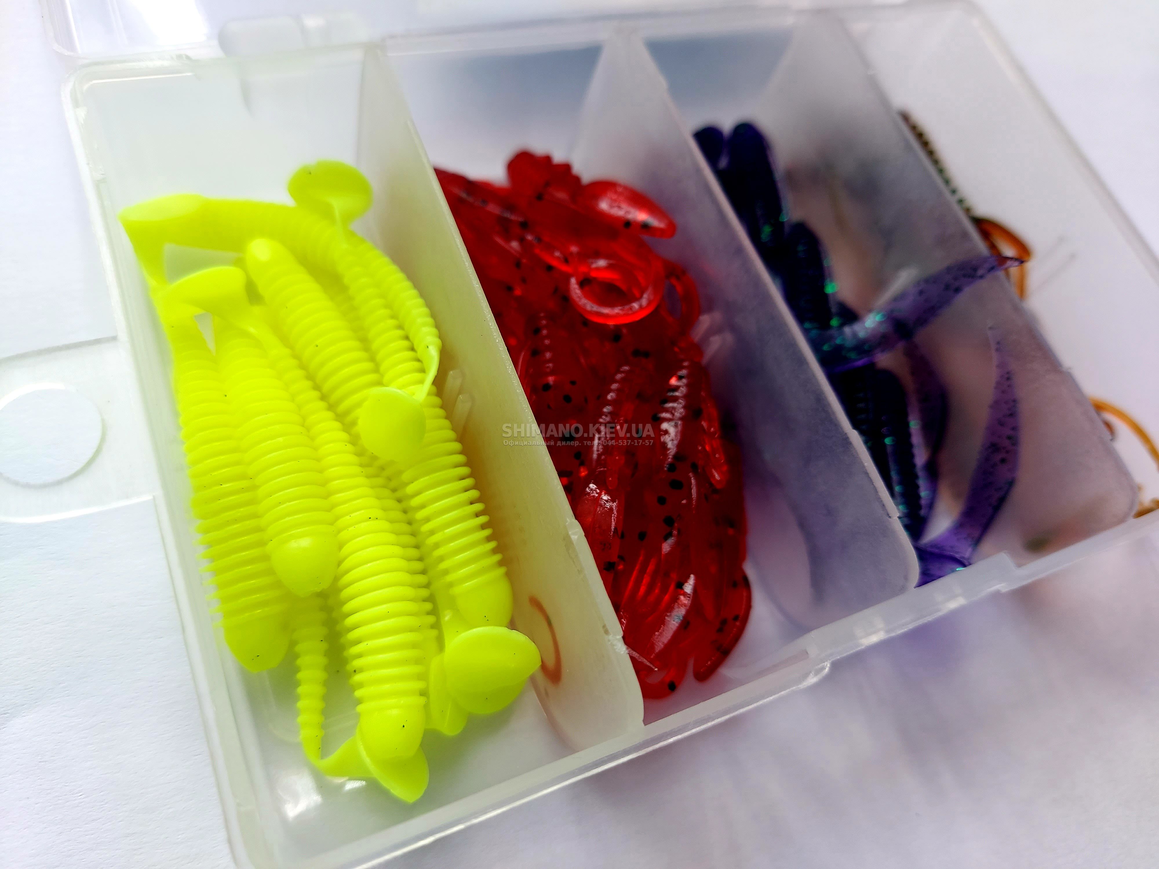 У джиг-набір підібрано 5 видів їстівних приманок перевірених при окуні. У коробці присутні популярні у спінінгістів забарвлення та форми приманок, тому легко вибрати необхідне.