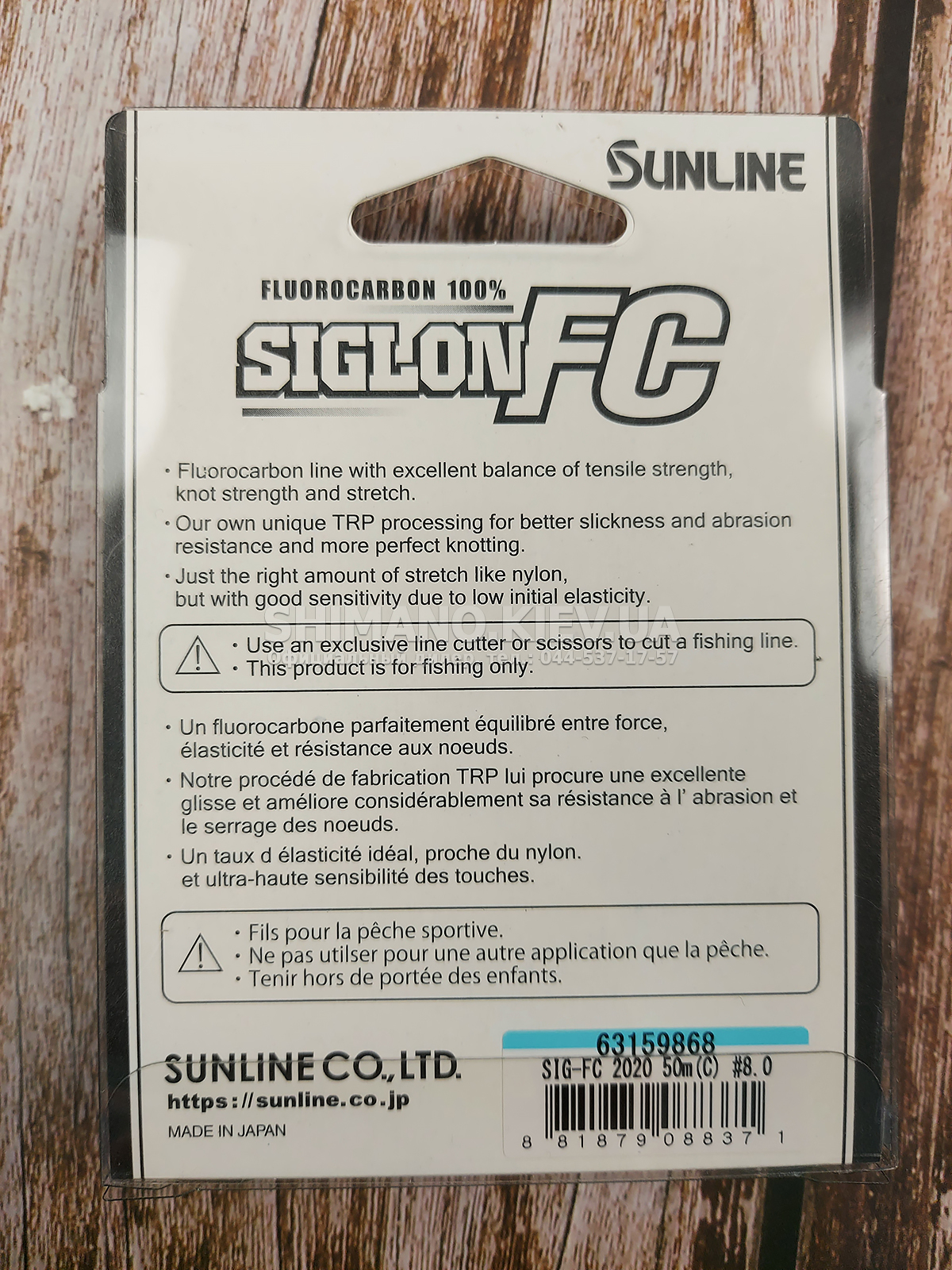 Спеціальний повідковий флюорокарбон Sunline Siglon FC характеризується підвищеною жорсткістю, але водночас максимальною зносостійкістю. Широкий спектр діаметрів дозволить підібрати флюорокарбон як для ультралайтового повідця для лову обережного окуня в прозорій воді, так і повідець, який зможе більшою мірою протистояти щучим зубам. Завдяки зручним розмотуванням (30 і 50м) та демократичній ціні, Siglon FC швидко завоював популярність у наших рибалок.