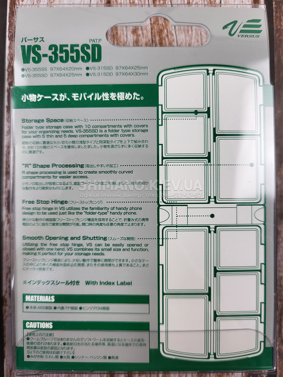 Легко поміщається в кишеню нахлистового жилета щільно прилеглі напівпрозорі кришки з ABS-пластику, що відрізняється підвищеною стійкістю до ударів. Free stop hinge — шарнірне з'єднання, яке зазвичай використовується в телефонах типу "розкладачка", дозволяє м'яко відкривати і закривати коробку однією рукою. 10 відділень VS-355, (з них три на знімних роздільниках). Усі дрібні відділення під напівпрозорими кришками.