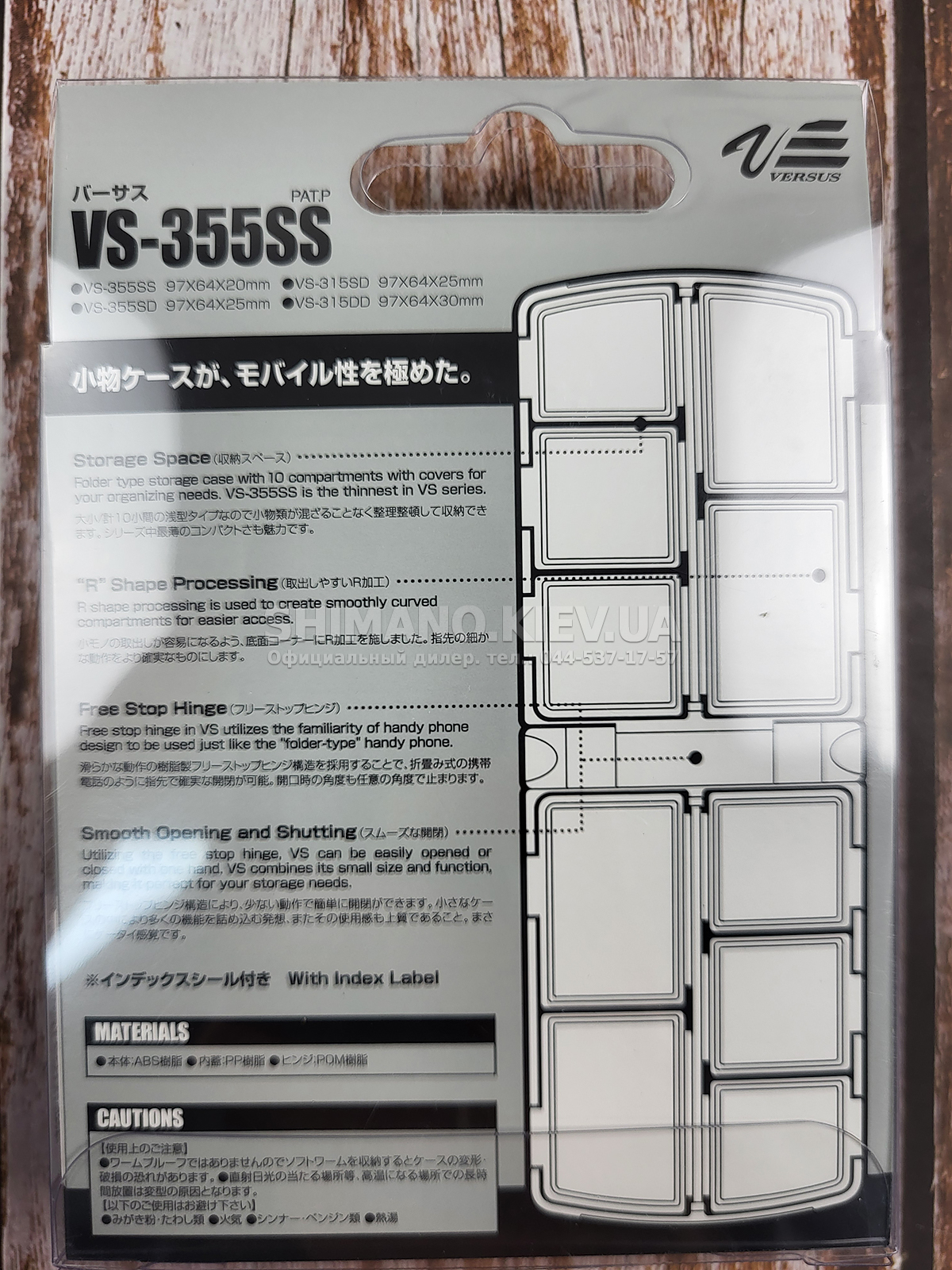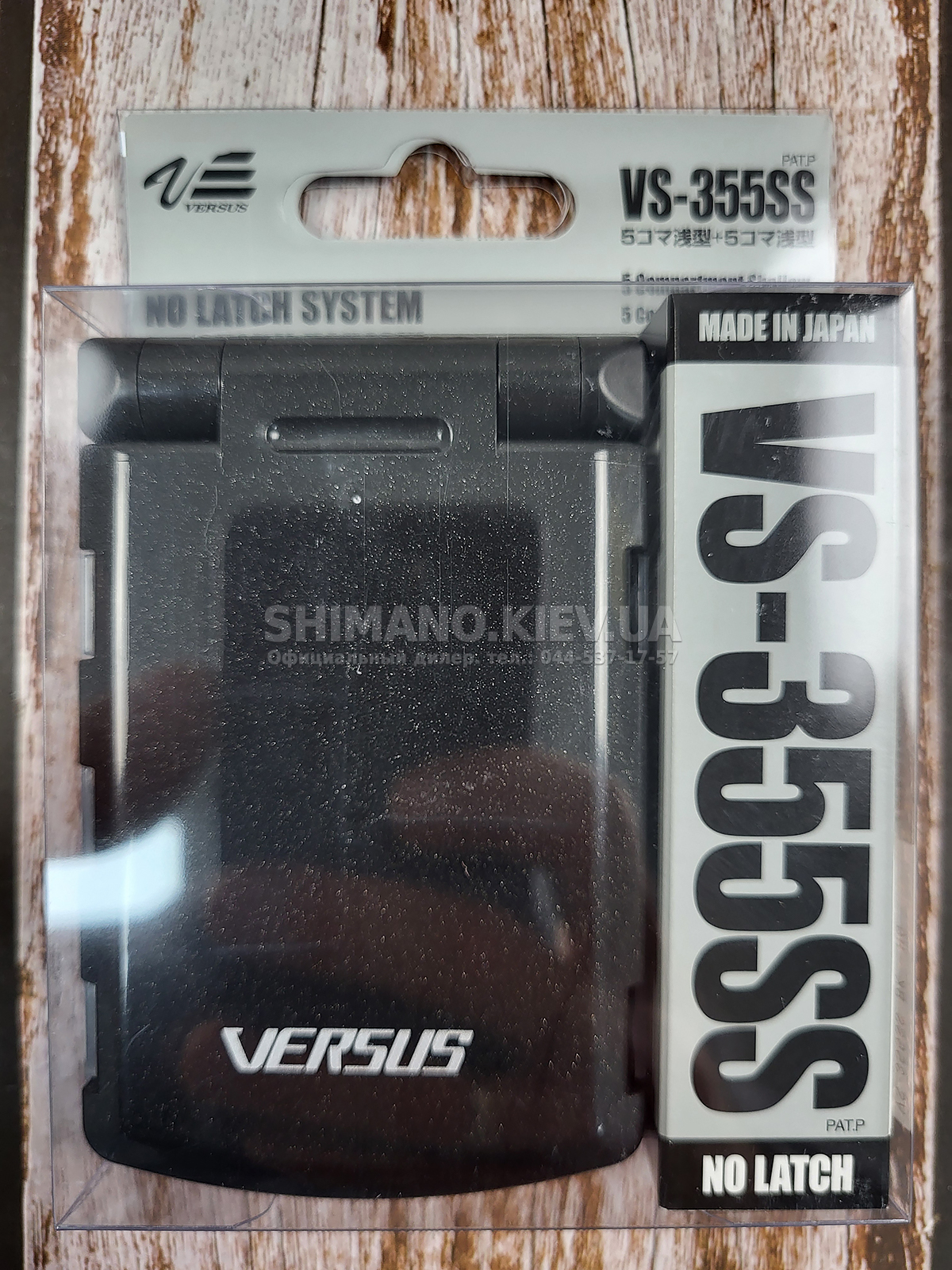 Легко поміщається в кишеню нахлистового жилета щільно прилеглі напівпрозорі кришки з ABS-пластику, що відрізняється підвищеною стійкістю до ударів. Free stop hinge — шарнірне з'єднання, яке зазвичай використовується в телефонах типу "розкладачка", дозволяє м'яко відкривати і закривати коробку однією рукою. 10 відділень VS-355, (з них три на знімних роздільниках). Усі дрібні відділення під напівпрозорими кришками.