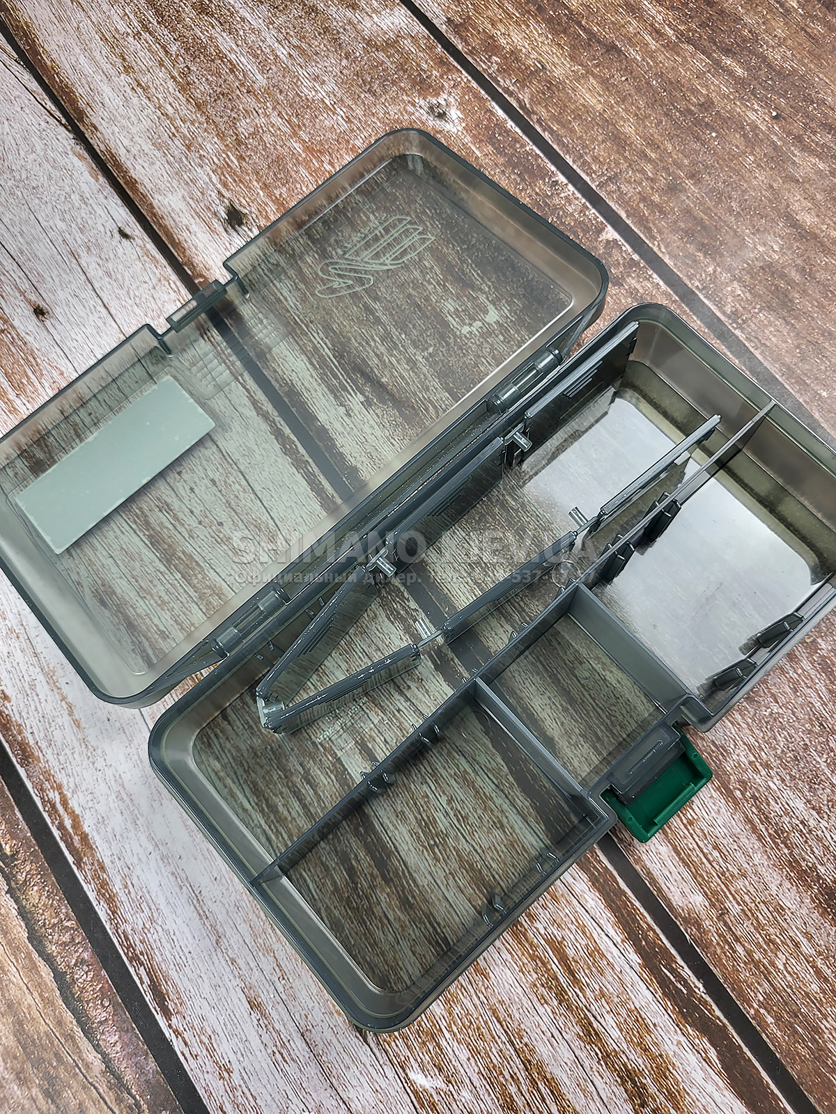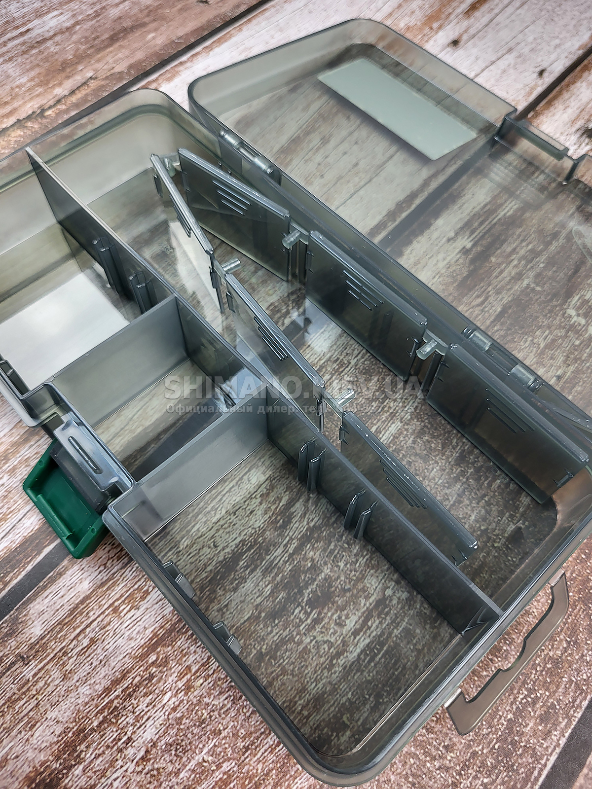 Коробка, призначена для зберігання приманок спінінгів невеликого розміру. Обладнана фіксованими та знімними перегородками. Виконана з темно-сірого напівпрозорого пластику, кришка обладнана надійним шарніром та клямкою. Глибина 29 мм.