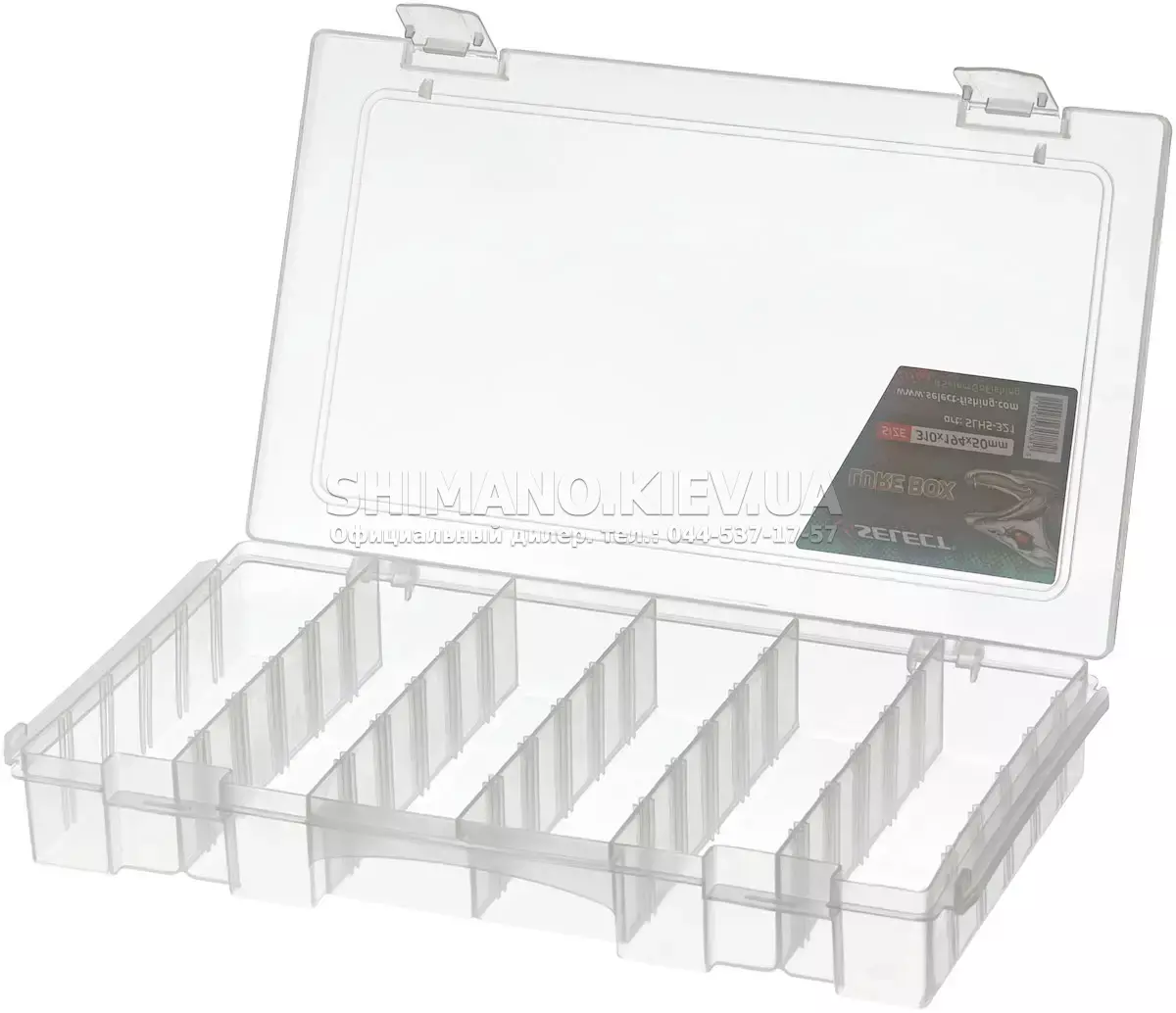 Коробка Select Lure Box максимально пристосована для зберігання приманок і рибальських аксесуарів. Для її виробництва використаний практичний пластик, що витримує деякі ударні навантаження і не вступає в реакцію з різними силіконами. Широкий асортимент моделей різних габаритів і комбінацій внутрішніх відсіків, допоможе підібрати коробку для зберігання приманок практично будь-якого розміру.Коробка Select Lure Box SLHS-321 завдяки великій кількості відсіків і своєму тонкому дизайну, може вмістити велику кількість воблерів, блешень, силіконових приманок або оснасток і аксесуарів для лову білої риби, і, при цьому, не займе багато місця в рибальській сумці або рюкзаку. Розміри внутрішніх відсіків можна самостійно регулювати за допомогою перегородок, які йдуть в комплекті. Верхня кришка оснащена надійними поворотними петлями і двома вбудованими застібками. Коробка Select Lure Box SLHS-321 підходить для встановлення в ящик Select Tackle System SLHS-320 для різноманітності комплектів снастей, які можна брати із собою на різні види риболовлі.