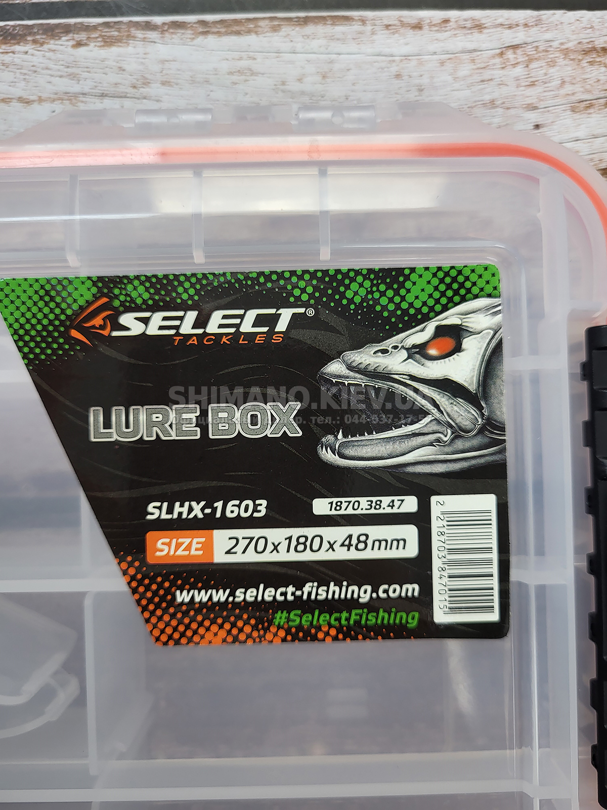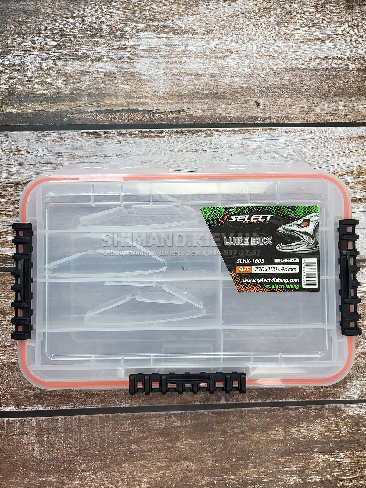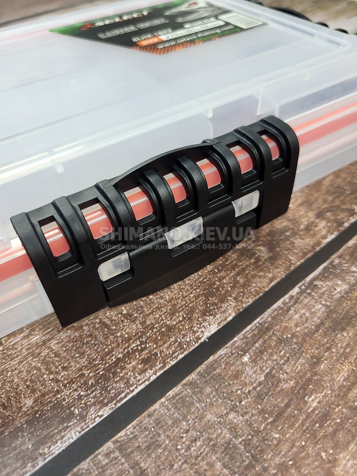 Коробка Select Lure Box максимально пристосована для зберігання приманок і рибальських аксесуарів. Для її виробництва використаний практичний пластик, що витримує деякі ударні навантаження і не вступає в реакцію з різними силіконами. Широкий асортимент моделей різних габаритів і комбінацій внутрішніх відсіків, допоможе підібрати коробку для зберігання приманок практично будь-якого розміру.Коробка Select Lure Box SLHX-1603 має водонепроникну конструкцію для захисту вмісту від намокання. Для забезпечення такої функції у кришці передбачений силіконовий ущільнювач, а застібки створюють щільну фіксацію з трьох сторін. Внутрішній простір коробки складається з чотирьох вузьких поздовжніх відсіків та одного широкого поперечного. Їх можна додатково розділяти під свої потреби наявними перегородками.