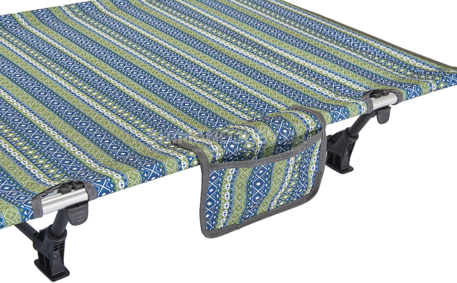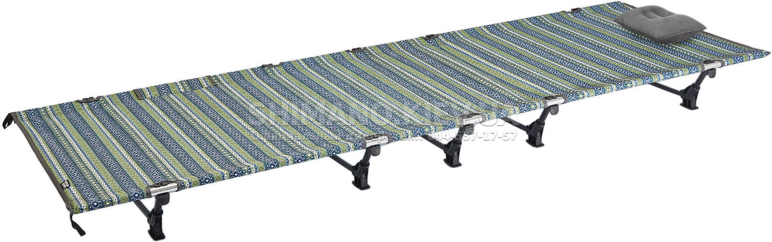 Ліжко виготовлене з текстилю. Каркас моделі виконаний з міцних алюмінієвих труб, з'єднаних посиленими кріпленнями, здатних витримувати великі навантаження. Ліжко обладнане сітчастою кишенею для зберігання необхідних дрібниць під час відпочинку.
