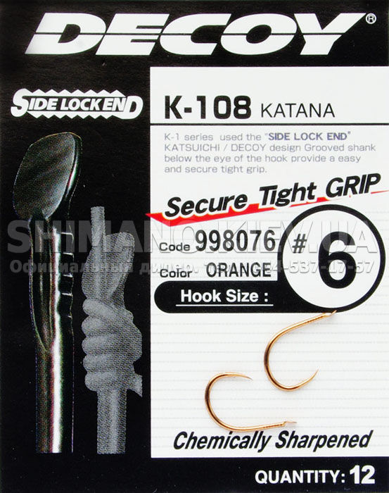 Decoy K-108 - гачки найвищої якості універсального напряму. Жала з хімічним заточуванням загнуті всередину, завдяки чому забезпечується хороше падсікання риби і зменшується кількість сходів. Гачок оснащений лопаткою з системою "Side Lock End", що має спеціальні насічки на цівці в тому місці, де повинен розташовуватися вузол. Завдяки цьому волосінь затягується більш щільно і без зайвих вигинів, що запобігає її ковзанню і перетиранню в місці кріплення. Спеціальне покриття мідного кольору виділяє гачок на дні водоймища, що додатково привертає увагу риби. Decoy K-108 підійде для лову більшості видів мирної риби з допомогою поплавцевою вудки або фідерного вудилища.