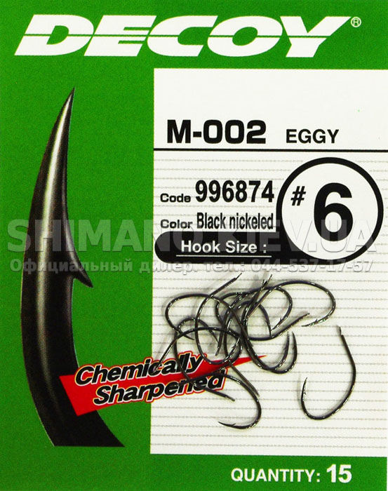 Гачок Decoy M-002 має дуже незвичайну форму, що нагадує яйце. Завдяки цьому він дуже легко проникає в рот риби і зводить до мінімуму вірогідність її сходу. Тонкий дріт, з якого виготовлений гачок і наявність лопатки для прив'язування вузла, роблять його максимально легким, так що риба не відчує каверзи при заковтуванні наживки. Гачок дуже добре працює з такими наживками, як опариш і мотиль, так як не пошкоджує їх при наживленні. Decoy M-002 застосовується в поплавцевій і фідерній риболовлі при лову будь-якої білої риби, в тому числі і великого ляща.