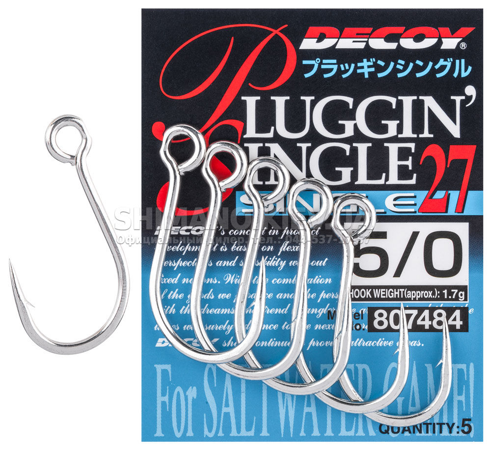 Гачок Decoy Single27 Pluggin Single – потужні ковані японські одинарні гачки з розгорнутим вушком. В першу чергу вони призначені для оснащення морських воблерів і інших об'ємних приманок.