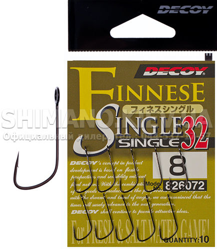 Гачок Decoy Single 32 призначений для оснащення силіконових приманок при ловлі хижої риби. Що особливо, форма гачка була розроблена у співпраці з вітчизняними рибалками-спортсменами, які вважаються одними з кращих спінінгістів в світі. Правильно підібрана товщина дроту і особливий вигин, дозволяють приманці краще утримуватися на гачку і рибі значно складніше поцупити її. Також, така форма здатна витримати великі навантаження і менше схильна до розгинання. Single 32 має збільшене вушко для більшої свободи при здійсненні проводки.
