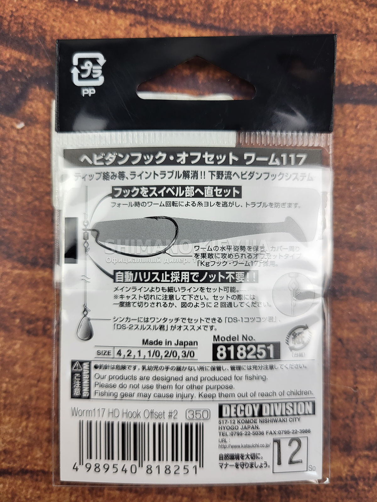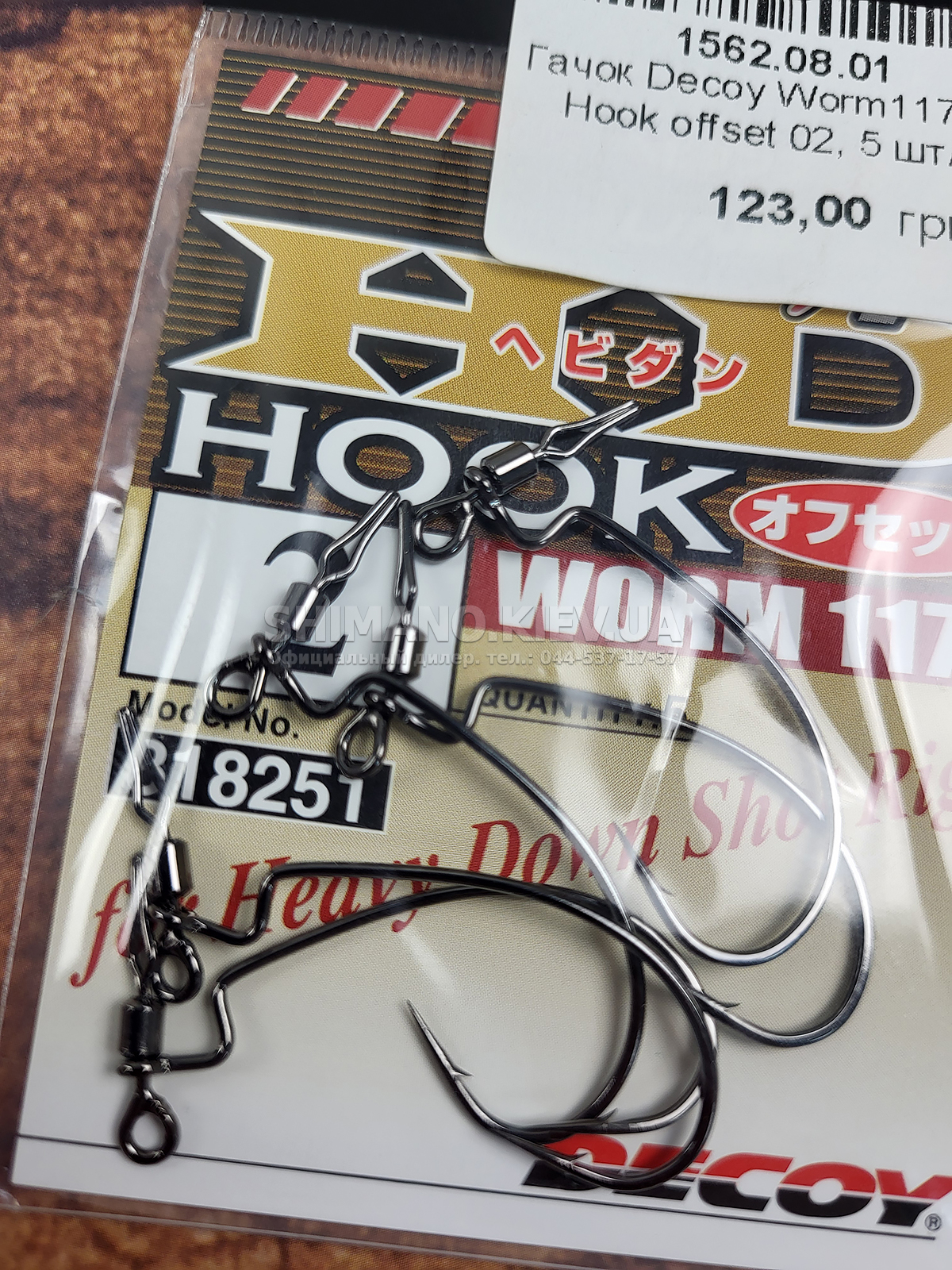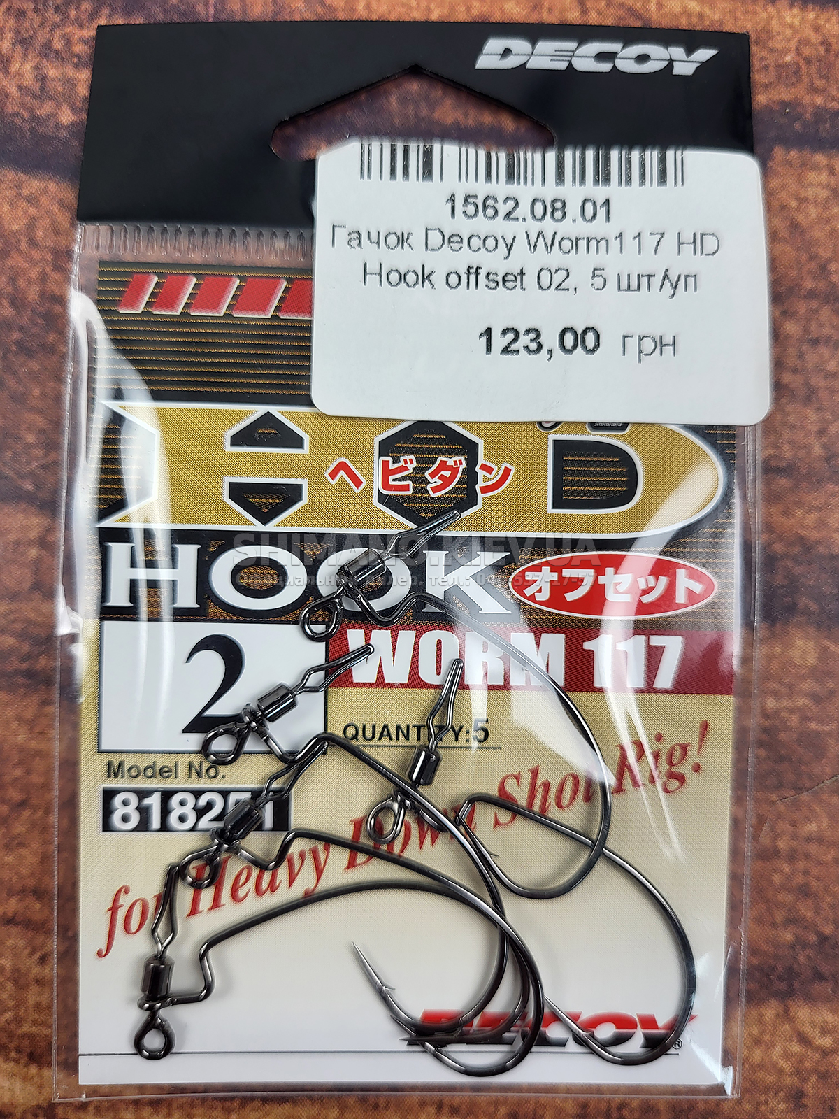 HD Hook offset Worm117 - оригінальна розробка компанії DECOY - офсетний гачок для лову на дроп-шот, який змонтований на спеціальному вертлюзі, завдяки чому принада завжди вертикально розташована у воді. Крім того він може обертатися навколо своєї осі при цьому не закручуює волосінь. При наявності течії принада завжди зорієнтована суворо за течією, що забезпечує більш натуральну гру. У нижній частині вухо вертлюга має особливу форму, яка дозволяє затискати в ньому жилку без вузла. Таке з'єднання дає можливість рибалці швидко та легко змінювати довжину відрізка волосіні між вантажем і приманкою.