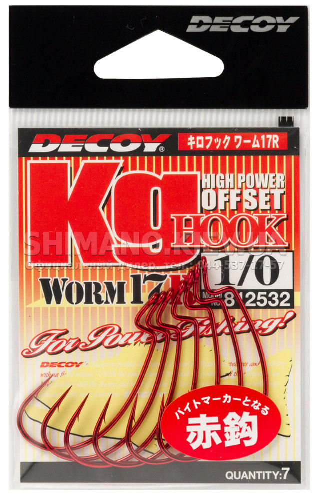 Гачок Decoy Worm17R Kg Hook R – серія потужних офсетників, які пофарбовано у червоний колір. Таке колірне рішення дозволить виділити приманку у воді і привернути увагу риби. Форма гачка ідеально підходить для оснащення віброхвостів і твістерів, що застосовуються при лові щуки і судака. Потужний дріт і якісна заточка гарантують блискавичну підсічку і надійне утримання риби.