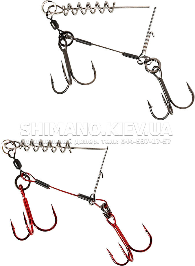 Оснащення Savage Gear Carbon49 Corkscrew Double Stinger має спеціальний штопор для надійного кріплення носової частини приманки і два потрійні гачки. Упаковка включає 2 оснащення - одна має червоні трійники, друга темні.