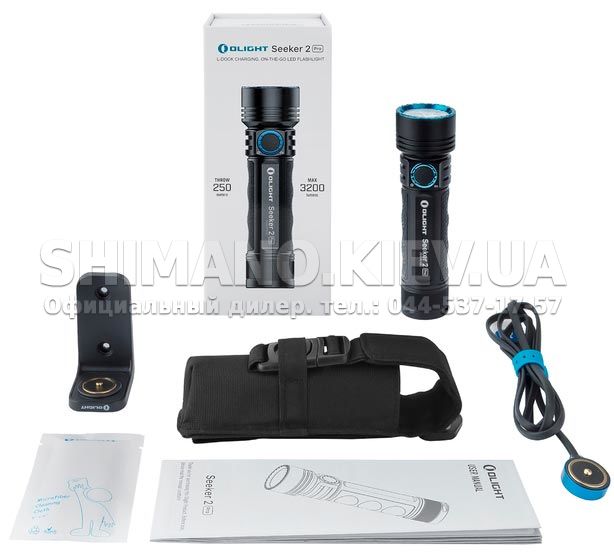 В комплекте с фонарем Olight Seeker 2 Pro поставляется аккумулятор, кабель зарядки с магнитным коннектором, док-станция для фиксации на стену, которая предусматривает магнитный коннектор, а также чехол-подсумок и детальная инструкция пользователя.