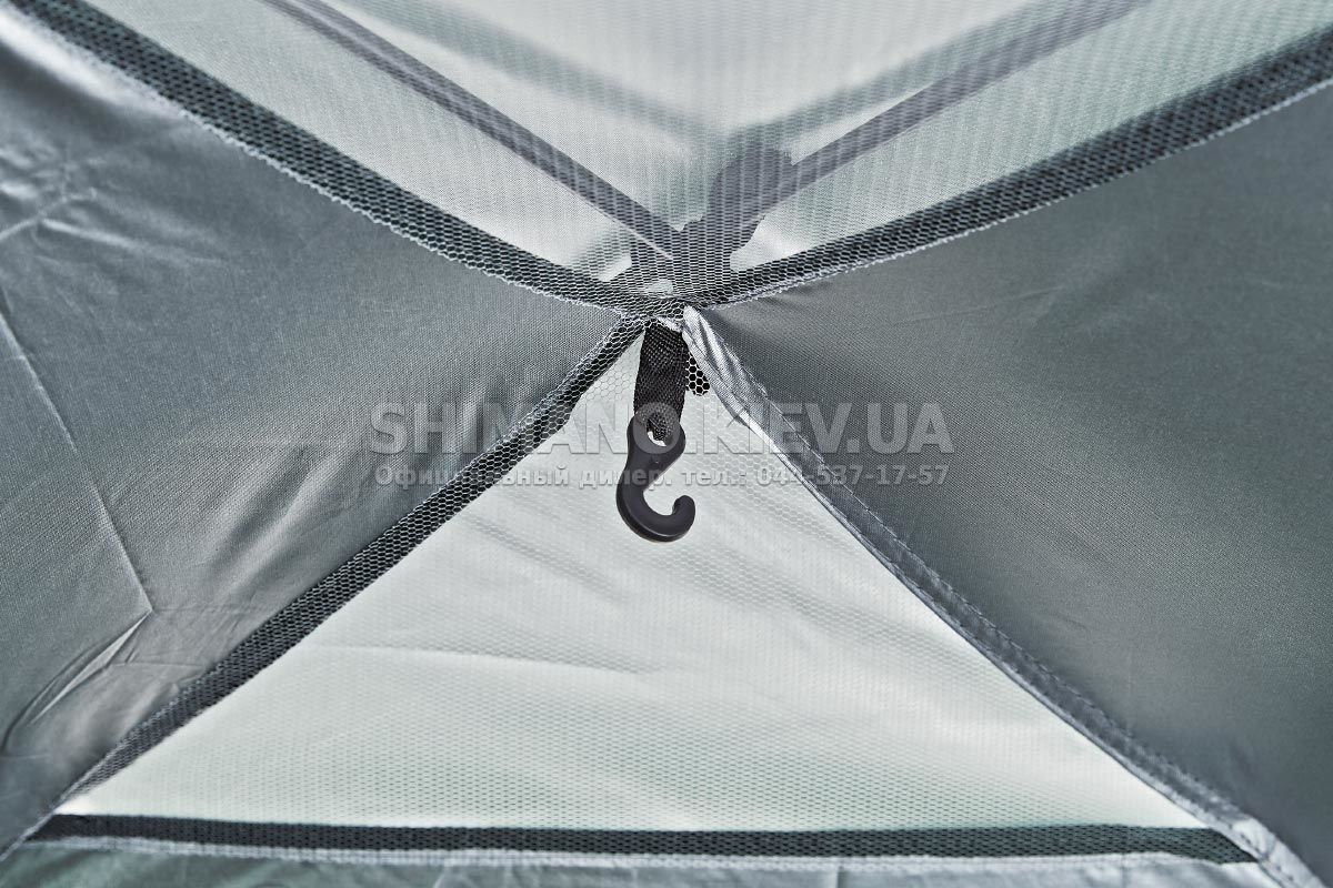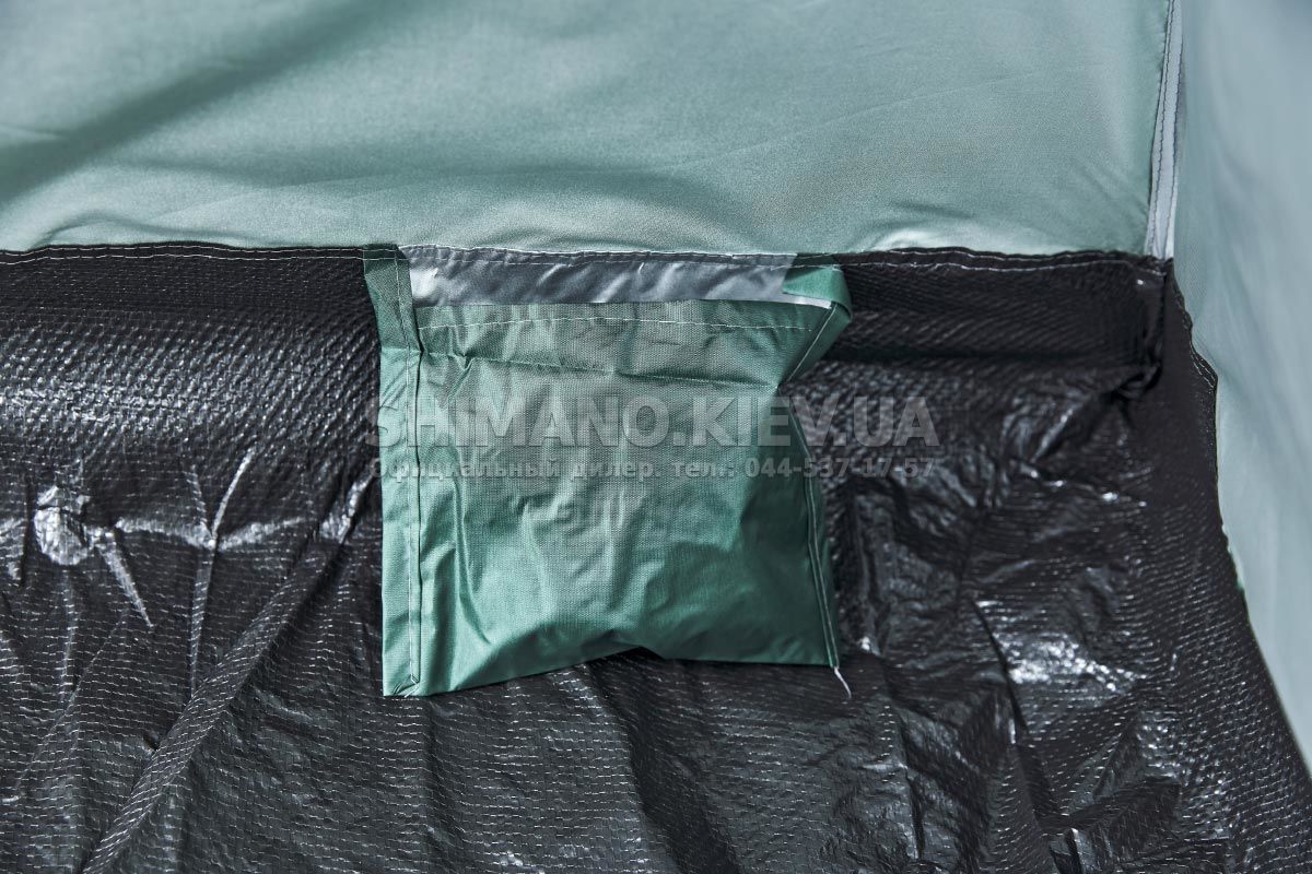 Вход-выход продублирован антимоскитной сеткой, что обеспечивает комфортную вентиляцию в жаркую погоду. Основная дверь и сетка оснащены двусторонней фурнитурой, что позволяет удобно открывать и закрывать их как снаружи, так и изнутри. Купол палатки также выполнен из сетки и защищен сверху небольшим тентом.
