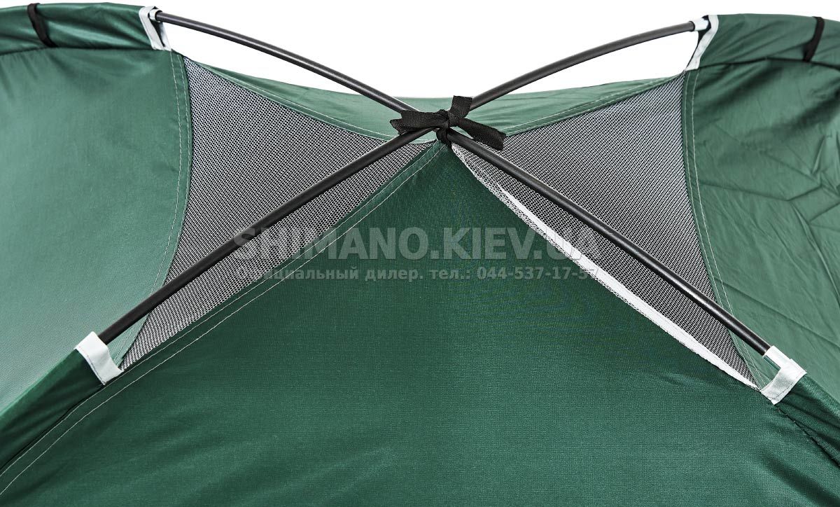 Каркас палатки представляет собой две составные дуги, все секции которых скреплены между собой резинкой, что предотвращает утерю одного из элементов и существенно упрощает процесс сборки. Дуги выполнены из трубчатого гибкого стеклопластика, способного выдерживать высокие нагрузки.