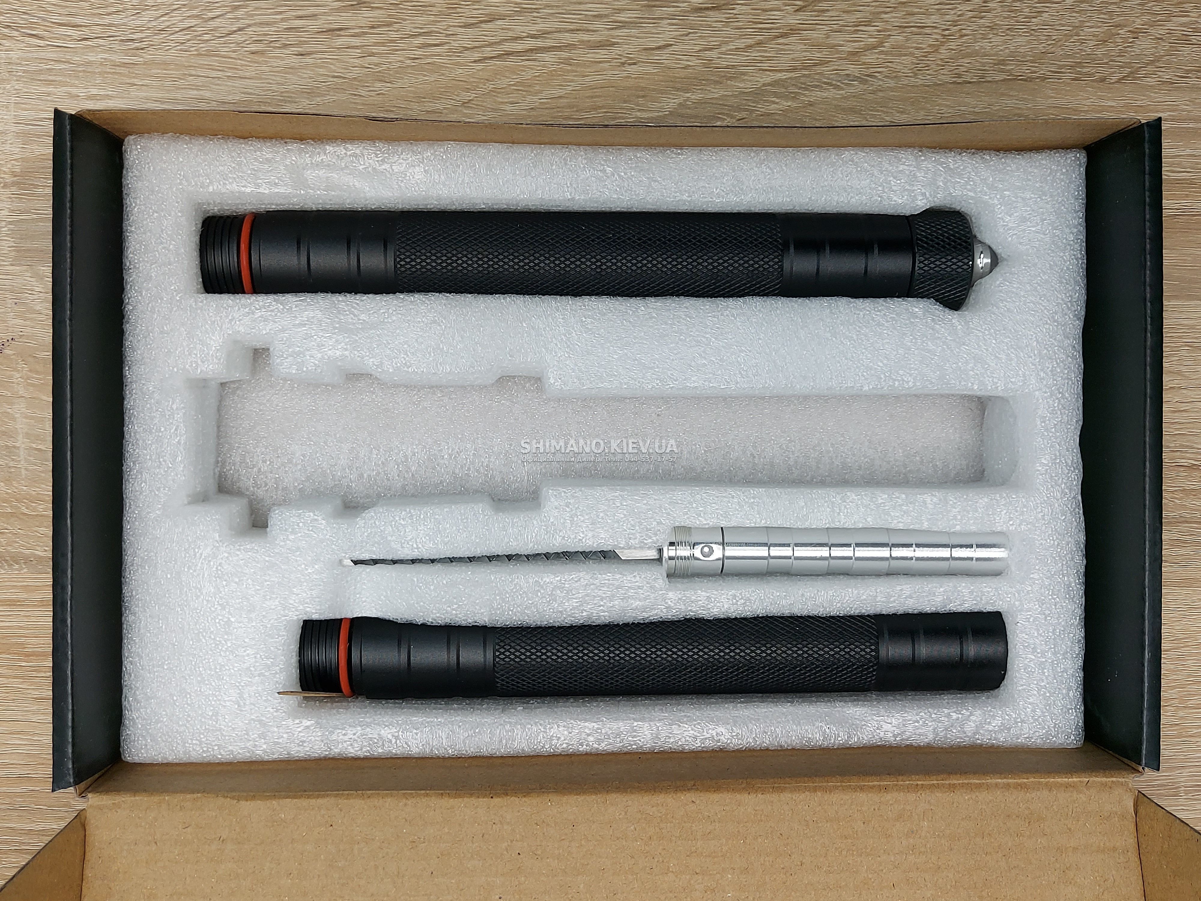 Полотно модели выполнено из качественной стали, 3х-компонентная рукоятка — из алюминия. Все сборные части плотно крепятся на резьбу.