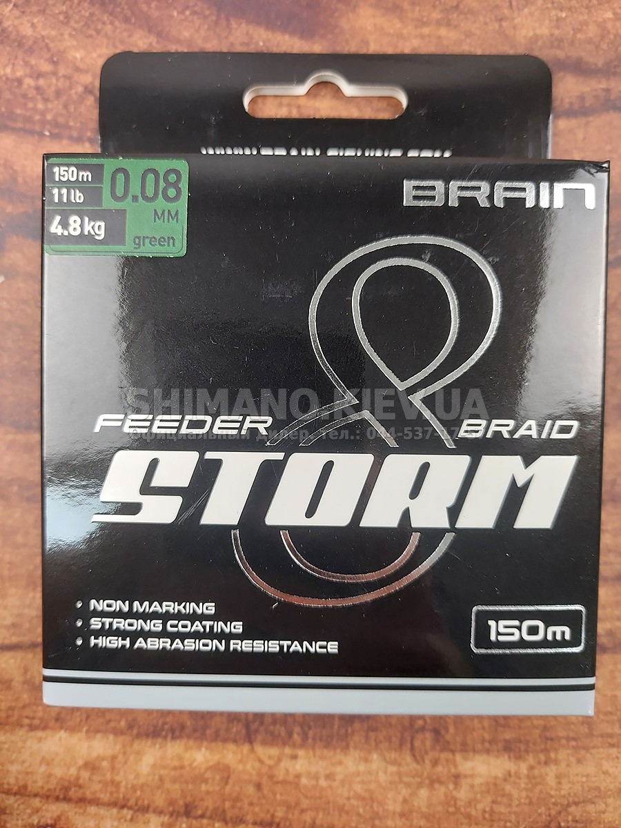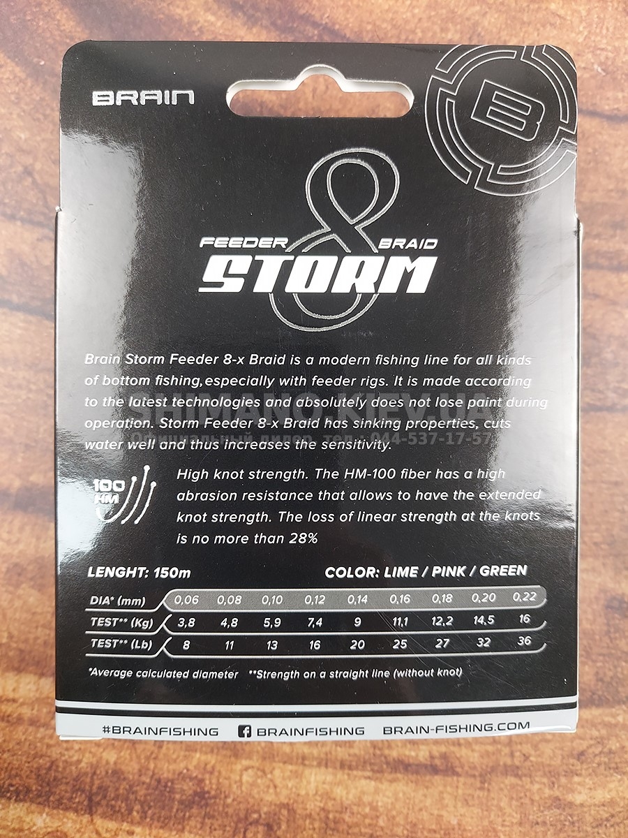 Шнур Brain Storm 8X - современная плетенка, подходящая под разные виды рыбалки, особенно под фидерную. Он обладает высокой абразивостойкостью и тонущими характеристиками, поэтому хорошо прорезает воду, повышая чувствительность снасти, а также менее подвержен износу при постоянных контактах с дном. Шнур имеет плотное плетение из 8-ми тончайших волокон с последующей поверхностной обработкой, благодаря чему очень гладким и скользким, что положительно сказывается на дальности заброса. Для производства использовано современное волокно HM-100, которое хорошо противостоит износу и имеет минимальные потери прочности на узлах, позволяя рыбалке использовать более тонкие диаметры для рыбалки, чем обычно.