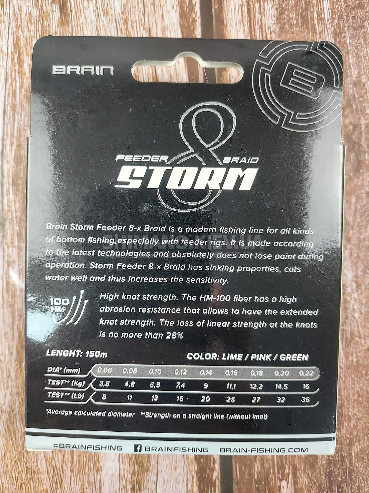Шнур Brain Storm 8X - современная плетенка, подходящая под разные виды рыбалки, особенно под фидерную. Он обладает высокой абразивостойкостью и тонущими характеристиками, поэтому хорошо прорезает воду, повышая чувствительность снасти, а также менее подвержен износу при постоянных контактах с дном. Шнур имеет плотное плетение из 8-ми тончайших волокон с последующей поверхностной обработкой, благодаря чему очень гладким и скользким, что положительно сказывается на дальности заброса. Для производства использовано современное волокно HM-100, которое хорошо противостоит износу и имеет минимальные потери прочности на узлах, позволяя рыбалке использовать более тонкие диаметры для рыбалки, чем обычно.