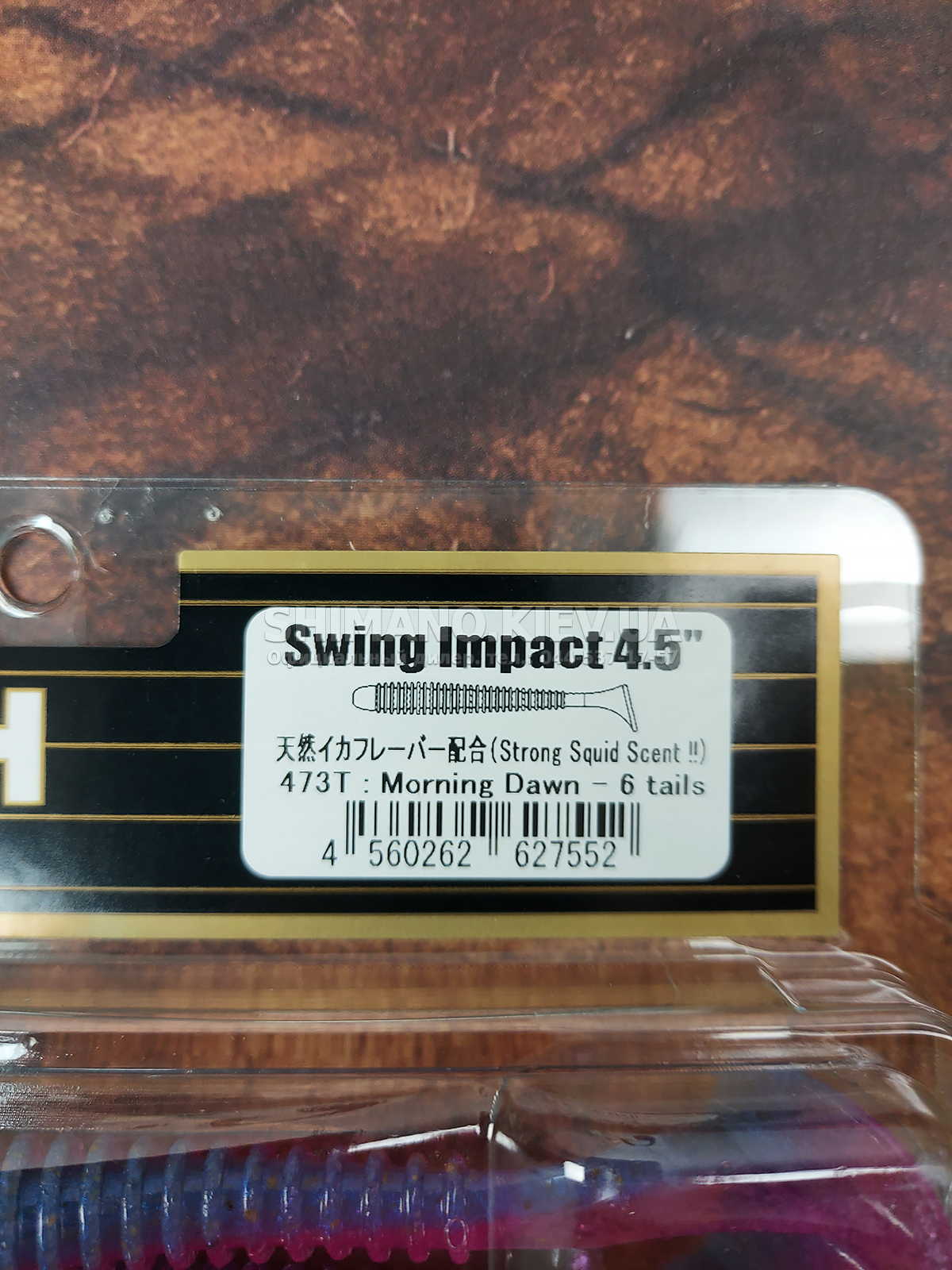 Swing Impact представляет собой виброхвост с удлинненым ребристым телом. Тело приманки имеет оригинальную форму, сечение отличается в передней(А) и задней(В) части приманки, что придает ей особую игру. Пятка виброхвоста очень подвижная и включается в игру при самой медленной проводке. Ребристость на теле приманки создает дополнительные возмущения в водной среде, привлекающие хищника с большого расстояния. Swing Impact изготовлен из очень мягкого «съедобного» силикона, пропитанного аттрактантом. Приманка выпускается в в размерах 2, 3, 3.5, 4 дюйма. Четырехдюймовый вариант отличается от меньших наличием прорези для офсетного крючка. Swing Impact можно использовать как на джиг-головке, так и на шарнирном монтаже с оффсетным крючком и на классическом техасе.