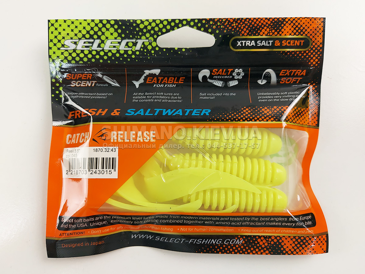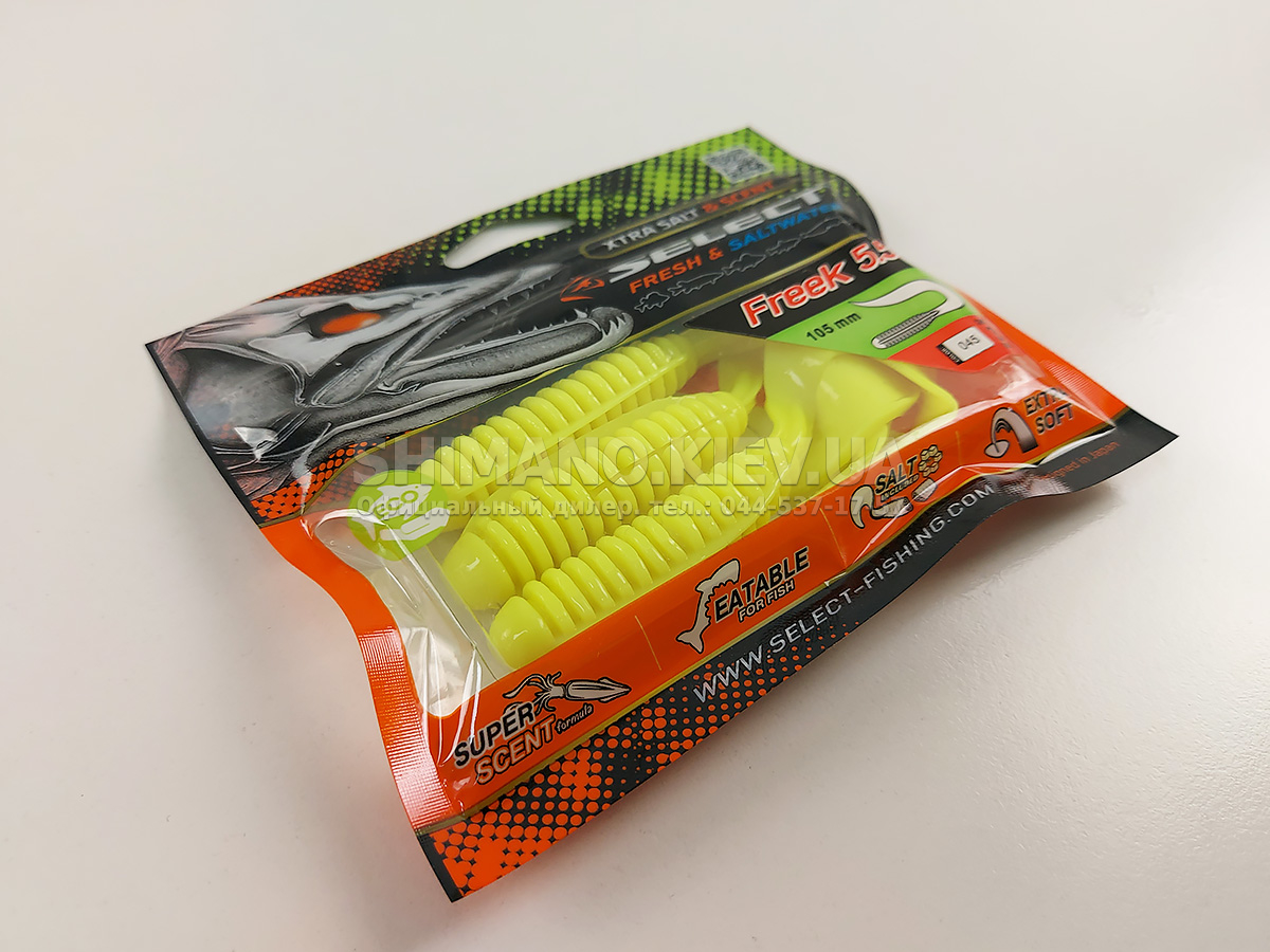 Новейшая приманка SELECT Freek. Ее мясистое тело и широкий хвост идеально подходят для лова судака, активного окуня и вечно голодной щуки. Необычная форма хвоста и специально подобранный силикон моментально включают приманку в игру, как на любой скорости проводки, так и на подбросе или в падении. Все это позволяет делать самую разную анимацию и успешно привлекать хищника по любой воде. Также стоит отметить, что более плотное и широкое тело идеально подходит для разных типов оснастки, включая классический джиг и двойные крючки. Для достижения максимального эффекта, рекомендуем использовать шарнирный монтаж: дроп-шот, каролина, отводной поводок или груз «чебурашка». Как всегда, представлена огромная гамма цветов и в будущем — размеров.
