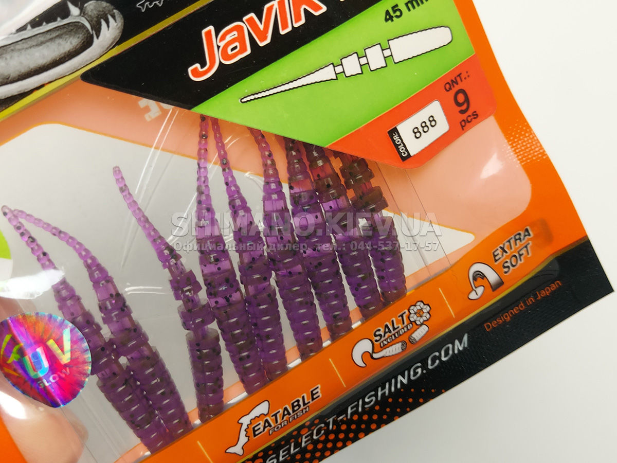 Select Javik является отличным примером имитации червя сложной формы, входящим в рацион питания большинства пресноводных рыб. Располагающиеся на срединно-хвостовом участке приманки изящные сегменты позволяют реализовывать природные движения червеобразных, а высокие съедобные свойства силиконового материала выступают дополнительным фактором к атаке приманки подводными обитателями.