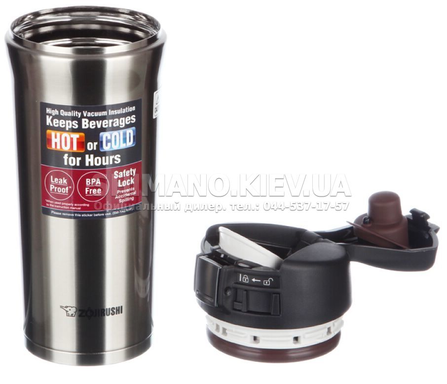 Уникальная крышка, которая автоматически открывается после одного нажатия, при этом механизм сконструирован так, чтобы предотвратить появление брызг при открывании. После нажатия кнопки, крышка немного приоткрывается, давая возможность стечь образовавшимся каплям. Полностью крышка распахнется только после того, как вы отпустите кнопку. Также крышка дополнительно оснащена блокировкой от случайного нажатия на кнопку открытия. Данную крышку с поилкой можно заменить на стандартную крышку Зоджируси, превратив таким образом термокружку в классический термос.