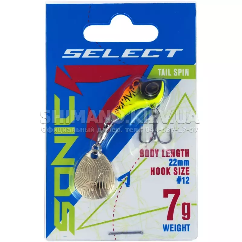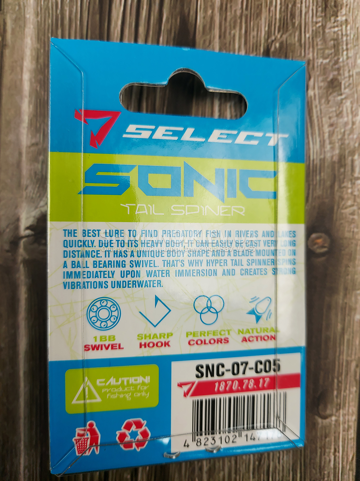 Тейл-спінер Select Sonic - це нова модель в лінійці приманок Select. Тейл-спінер Select Sonic відноситься до такого типу приманок, які користуються великою популярністю серед рибалок-спінінгістів. Він поєднує в собі вертушку, пілкер та ратлін по своїй роботі, але в той же час має свої особливості. Важке компактне свинцеве тіло у формі рибки дозволяє робити максимально далекі закидання. Навіть зустрічний або бічний вітер не завадить доставити приманку в потрібну точку. В тейл-спінері використовується стандартна краплеподібна пелюстка, змонтована на вертлюжці з підшипником, що забезпечує легкий старт приманки та її стабільну роботу. Спеціальний кембрик у місці кріплення пелюстки запобігає його перекручуванню під час закидання.Select Sonic можна спокійно назвати джиговою вертушкою, адже її основний робочий горизонт – це придонні ділянки. Ще одна перевага цієї приманки - вона зовсім не крутить шнур. Під час проводки пелюстка обертається, а тіло активно вібрує та стабілізує положення блешні у воді. Найбільш підходящий час для цієї приманки починається в другій половині весни і закінчується пізньої осені. Тейл-спінер Select Sonic чудово підійде для лову судака, щуки, жереха, окуня та деяких інших видів риб. Випускається у 4 розмірах: 7г, 10г, 13г, 17г.