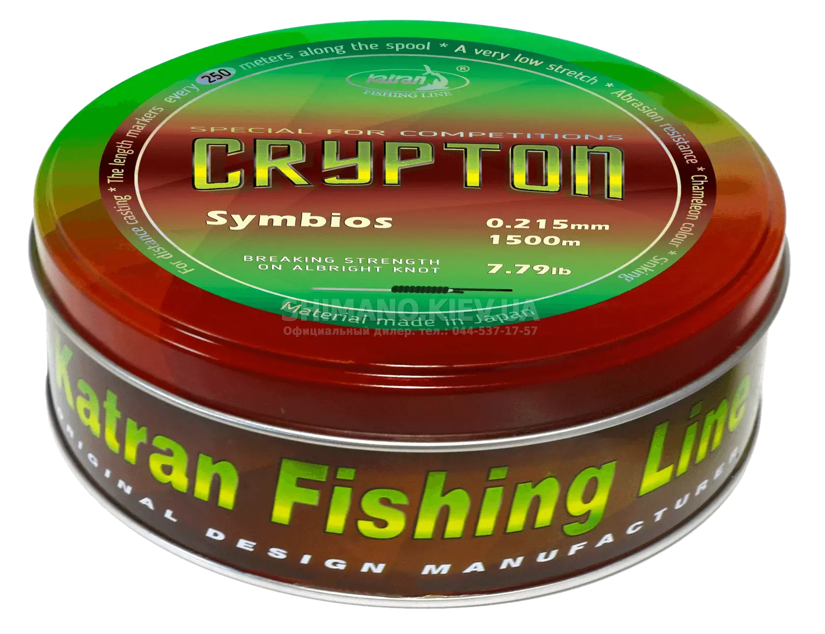 Волосінь Katran Crypton Symbios створена для коропової та фідерної риболовлі. Секрет успіху полягає в максимальному поєднанні її переваг перед конкурентами. Symbios - жилка вищого рівня. Відношення розривної міцності до діаметру – одне з найкращих серед монониток Katran. Ця волосінь – поєднання передових технологій, кращих властивостей та найвищих характеристик. Застосовано інноваційну технологію відбиття світла, яка маскує волосінь на будь-якому дні. Забарвлення волосіні Crypton Symbios складають відрізки по 50 см кольору Neon, що чергуються із відтинками такої ж довжини з кольором, що імітує колір дна. Непомітність волосіні у воді не лякає обережну рибу, а неонові секції водночас полегшують візуальний контроль, особливо пи штучному освітленні. Висока міцність вузла, низький коефіцієнт розтягування 13-14% та низька пам'ять – ще одні цінні переваги Crypton Symbios. Жилка відрізняється високою стійкістю до стирання, гладка, еластична, легко проходить крізь кільця вудлища, призначена для лову на далеких дистанціях. Гладке зовнішнє покриття захищає її від пилу та бруду, тому вона тривалий час зберігає початкові властивості. У розмотуванні є спеціальні позначки через кожні 250 м для точнішого розподілу запасу мотка на кілька котушок. Волосінь упакована в залізні банки, які чудово захищають її від ультрафіолету та механічних пошкоджень при транспортуванні.
