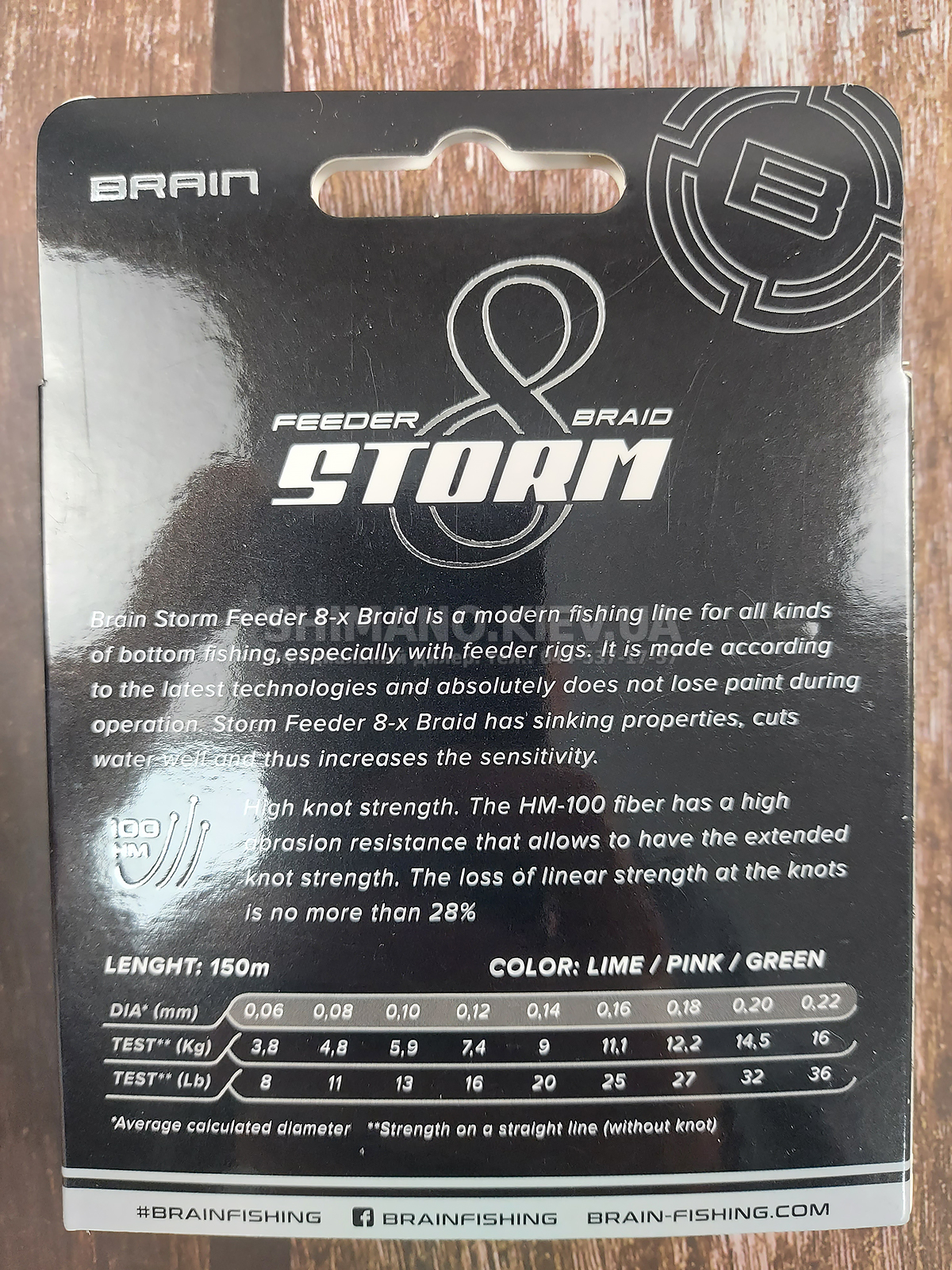 Шнур Brain Storm 8X - сучасна плетінка, що підходить під різні види риболовлі, особливо під фідерну. Він має високу абразивостійкість та тонучі характеристики, тому добре прорізає воду, підвищуючи чутливість снасті, а також менше схильний до зносу при постійних контактах з дном. Шнур має щільне плетіння з 8-ми найтонших волокон з подальшою поверхневою обробкою, завдяки чому є дуже гладким і слизьким, що позитивно позначається на дальності закидання. Для виробництва використано сучасне волокно HM-100, яке добре протистоїть зносу та має мінімальні втрати міцності на вузлах, дозволяючи рибалці використовувати більш тонкі діаметри для риболовлі, ніж зазвичай.