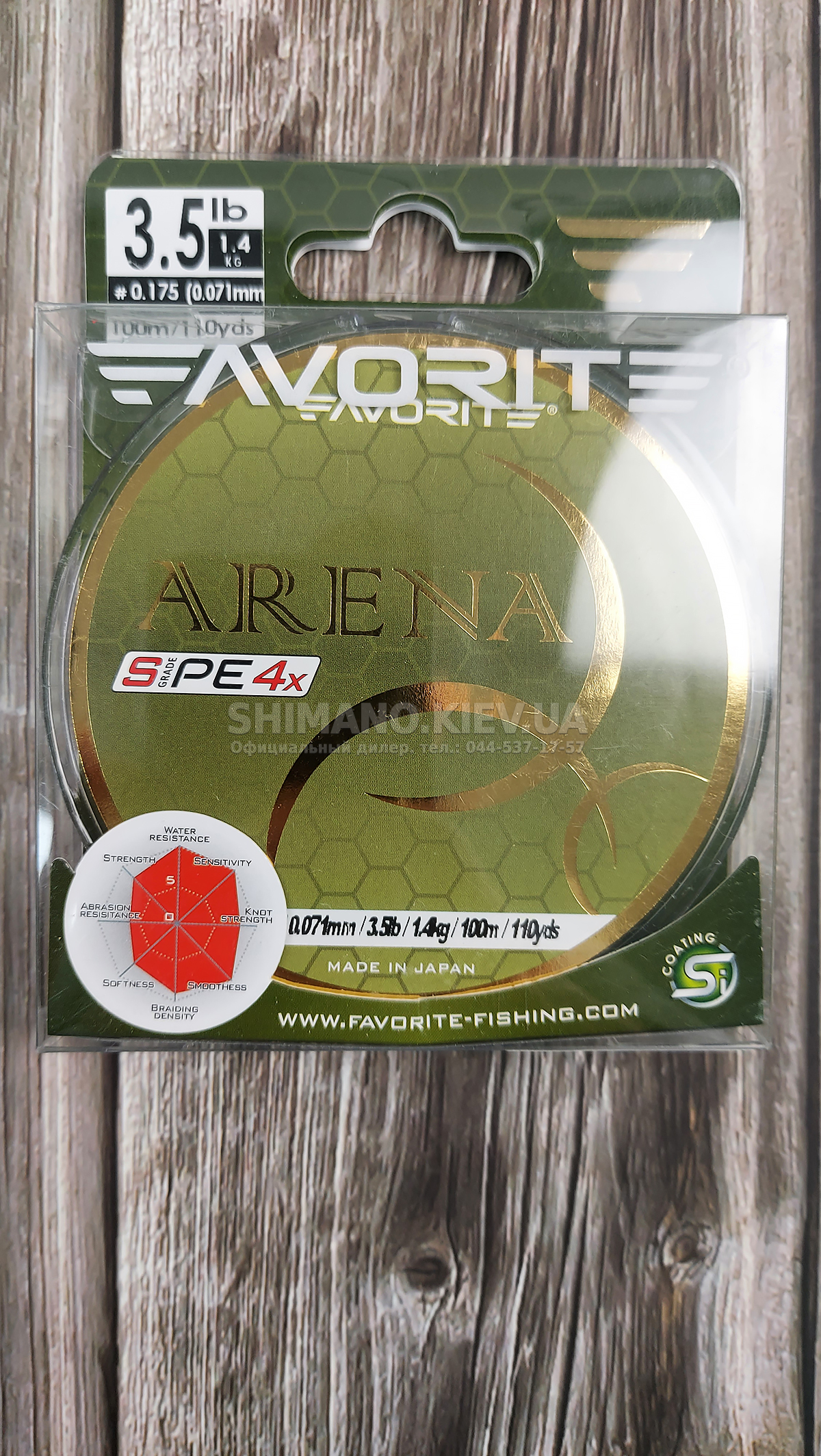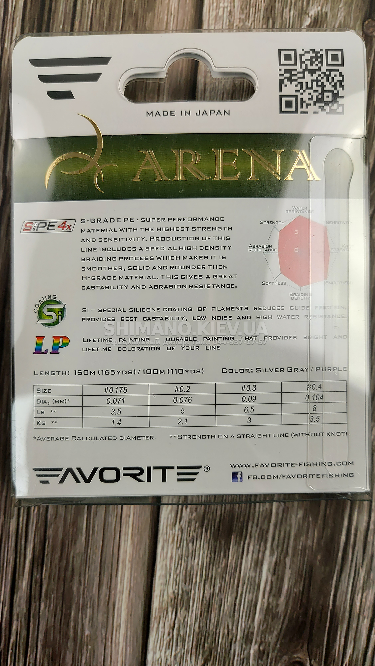 Шнур Favorite Arena PE – чотирижильний спеціалізований ареа шнур, розроблений для лову ультралайтовими снастями. Виконаний із сучасного високоміцного матеріалу S-Grade PE з дуже щільним плетінням. Завдяки цьому вдалося випустити дуже тонку і круглу нитку, що має високу чутливість і розривне навантаження. Силіконове покриття Si-coating (Silicone Coating) робить поверхню шнура гладкою та слизькою, що зменшує тертя в кільцях, дозволяє досягти високої дальності закидання та запобігає вбиранню води. Шнур випускається у двох кольорах: пурпуровий – яскравий та помітний для максимального контролю проводки та сіро-сталевий – мінімально помітний у воді, для лову дуже обережної риби. Сучасна технологія фарбування LP (Lifetime Painting) дозволяє тривалий час зберегти насичений колір шнура. Шнури Favorite Arena PE випускаються тільки в тонких розмірах від #0.175 до #0.4 за японською нумерацією. Тому вони найкраще підходять для форелевого лову та інших видів ультралайтової риболовлі, наприклад мікроджиг.