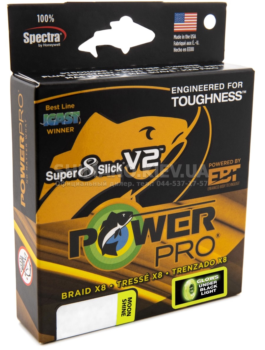 Шнур Power Pro Super 8 Slick V2 став логічним продовженням розвитку модельного ряду Super 8 Slick, який завоював заслужену популярність серед рибалок. Відмінною особливістю моделей цієї лінійки є гладкість поверхні за рахунок ромбоподібного плетива за технологією PowerPro Enhanced Body Technology. Саме з цим пов'язана і назва модельного ряду – Super 8 Slick. Надм'який матеріал пліток з 8-ми ниток, кожна з яких виткана з найтонших мікроволокон Spectra Fiber. За рахунок цього шнур став ще м'якшим. Особливість цього способу плетіння полягає в просоченні сплетених волокон так, щоб сформувалася монолітна структура. Таким чином, досягається гладка поверхня шнура, завдяки якій збільшується його міцність на вузлах, зменшується опір тертя про пропускні кільця та збільшується дальність закидів. Шнур Power Pro Super 8 Slick V2 чудово підійде для спінінгового, фідерного та морського лову.