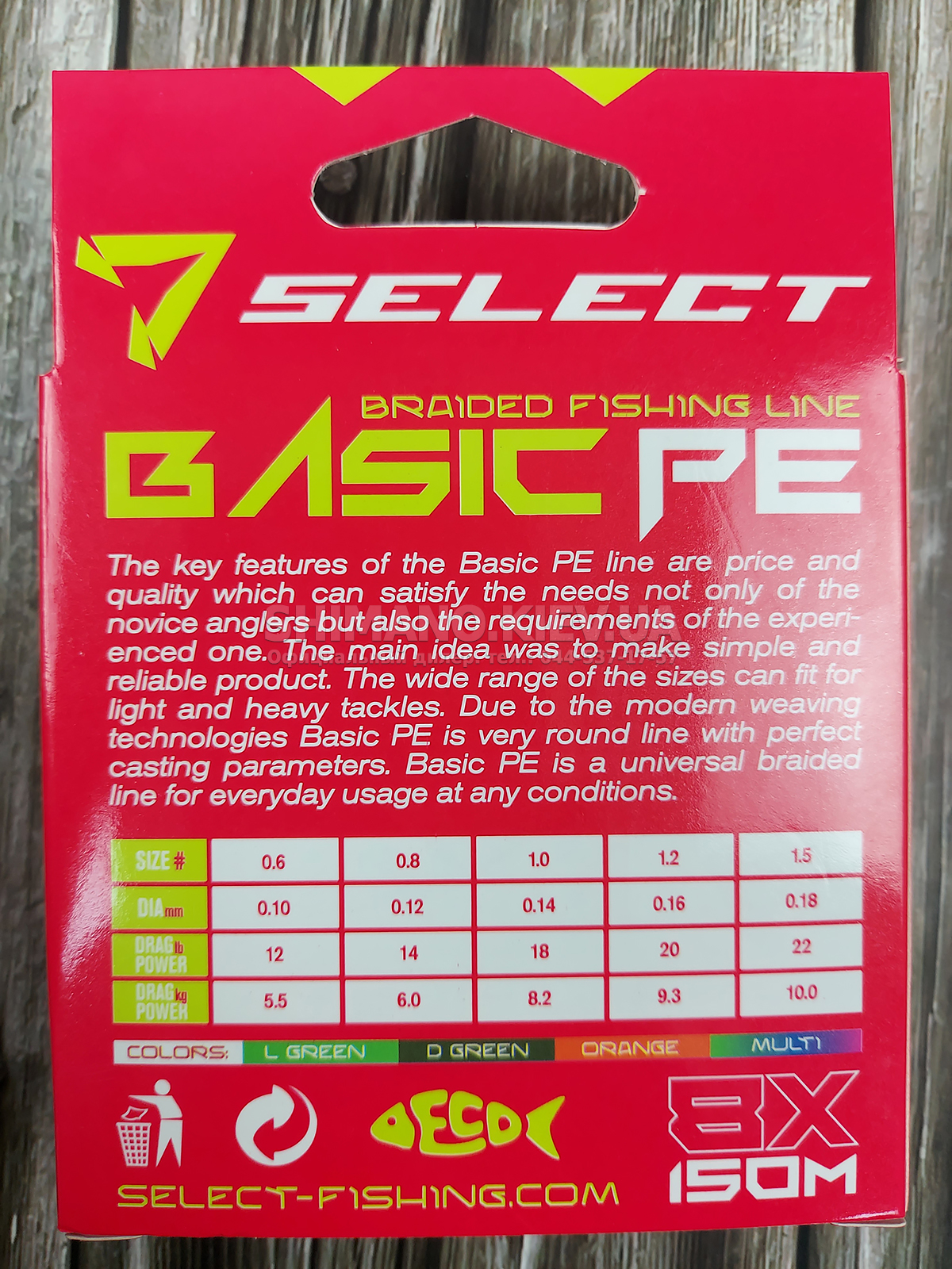 Шнур Select Basic PE 8x – восьмижильна модель з оптимальним співвідношенням ціни та якості, яка має універсальне призначення і здатна задовольнити потреби як рибалок-початківців, так і більш просунутих. Волокна виготовлені з сучасного матеріалу - високомодульного поліетилену (PE або по-іншому Dyneema), які повиті в щільну кіску, що має максимально круглий переріз і надзвичайну гладкість. Завдяки цьому шнур дуже міцний, м'який, легко злітає зі шпулі котушки, плавно ковзаючи по пропускних кільцях спінінга, має високу інформативність і абразивостійкість. Його рекомендується використовувати в тих видах лову, де потрібна висока дальність закидання та чутливість, наприклад, спінінгова або фідерна риболовля. Select Basic PE 8x випускається в розмотуванні 150 метрів і в різних діаметрах, що дозволить використовувати його в снастях різної потужності, а різні колірні рішення допоможуть підібрати шнур під будь-які умови лову.
