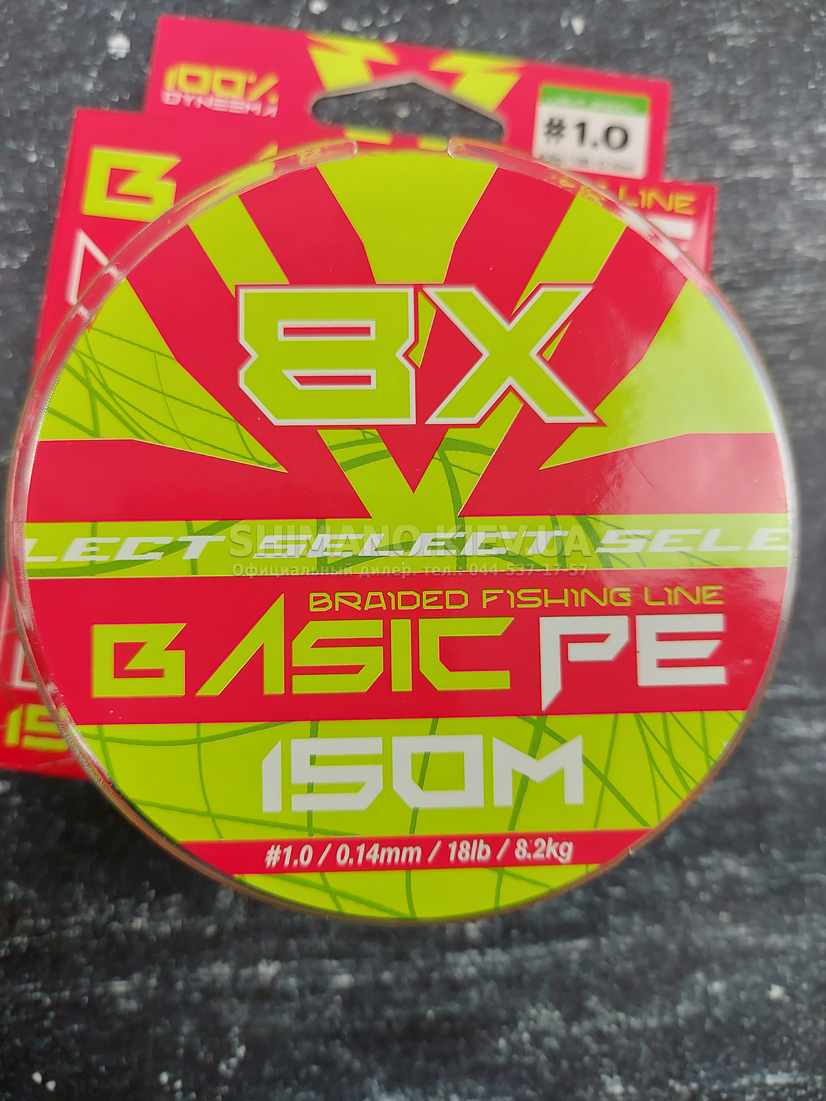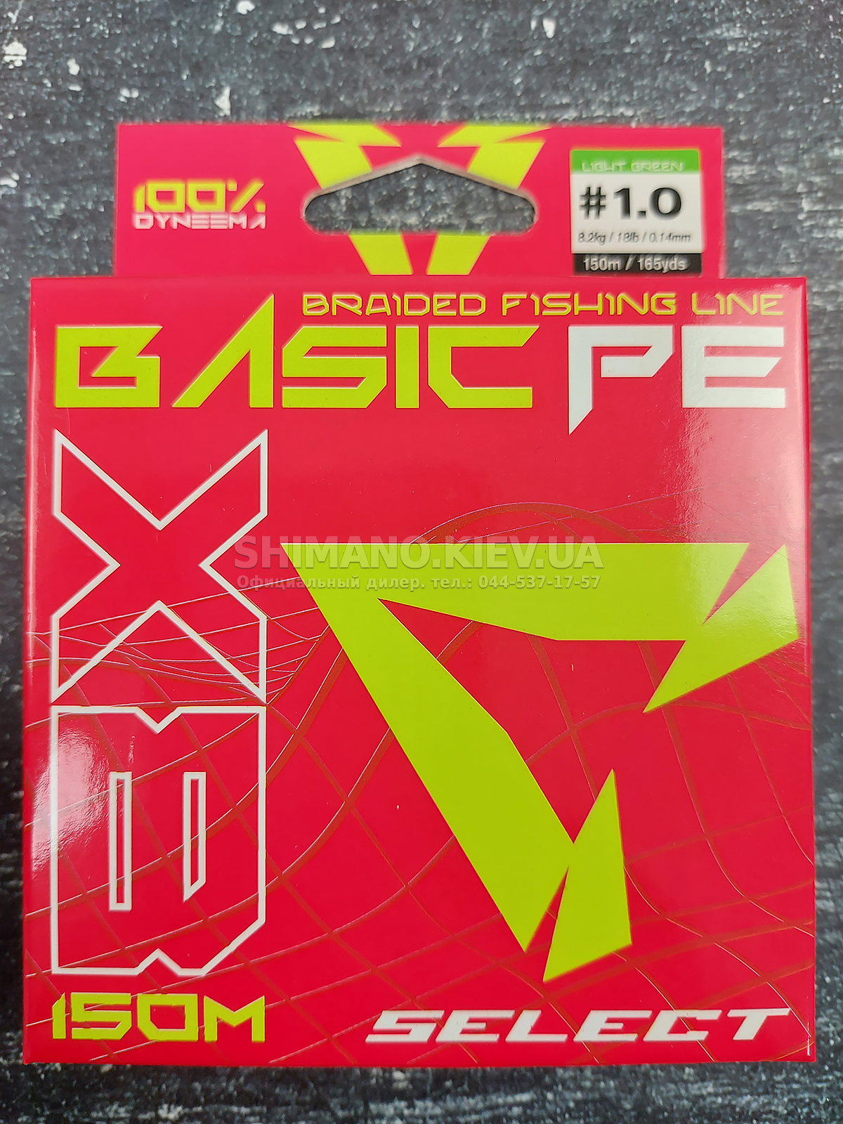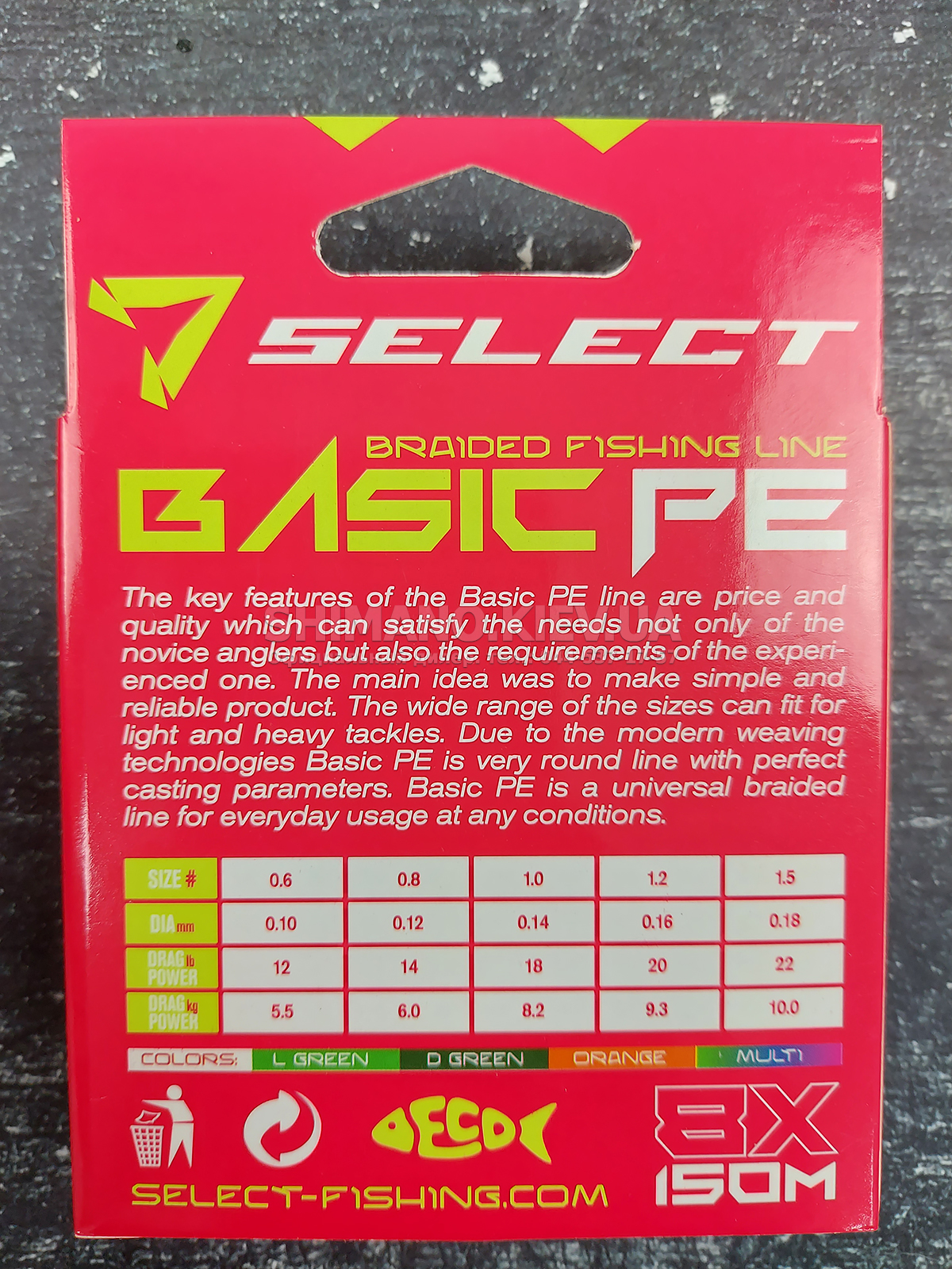 Шнур Select Basic PE 8x – восьмижильна модель з оптимальним співвідношенням ціни та якості, яка має універсальне призначення і здатна задовольнити потреби як рибалок-початківців, так і більш просунутих. Волокна виготовлені з сучасного матеріалу - високомодульного поліетилену (PE або по-іншому Dyneema), які повиті в щільну кіску, що має максимально круглий переріз і надзвичайну гладкість. Завдяки цьому шнур дуже міцний, м'який, легко злітає зі шпулі котушки, плавно ковзаючи по пропускних кільцях спінінга, має високу інформативність і абразивостійкість. Його рекомендується використовувати в тих видах лову, де потрібна висока дальність закидання та чутливість, наприклад, спінінгова або фідерна риболовля. Select Basic PE 8x випускається в розмотуванні 150 метрів і в різних діаметрах, що дозволить використовувати його в снастях різної потужності, а різні колірні рішення допоможуть підібрати шнур під будь-які умови лову.