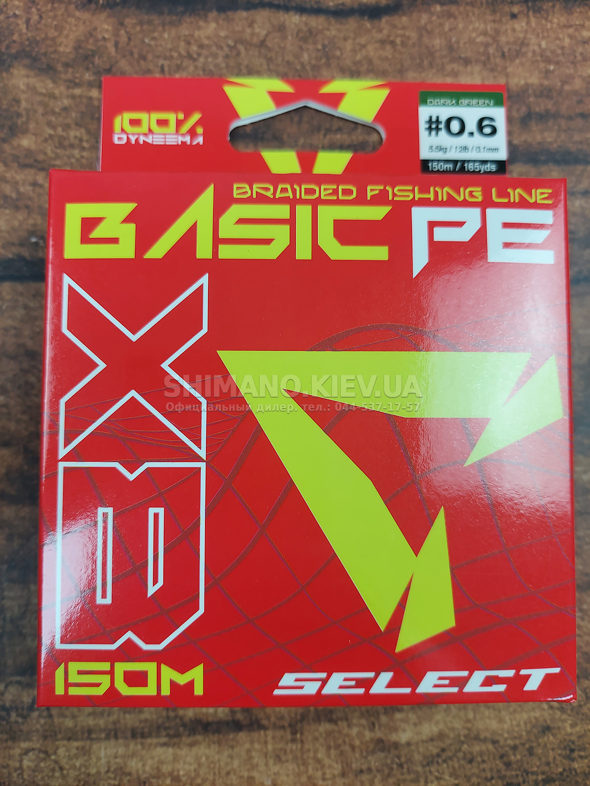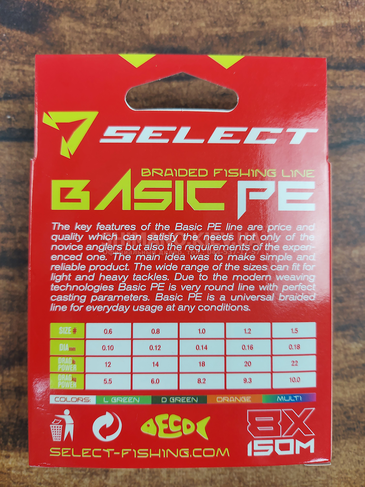 Шнур Select Basic PE 8x – восьмижильна модель з оптимальним співвідношенням ціни та якості, яка має універсальне призначення і здатна задовольнити потреби як рибалок-початківців, так і більш просунутих. Волокна виготовлені з сучасного матеріалу - високомодульного поліетилену (PE або по-іншому Dyneema), які повиті в щільну кіску, що має максимально круглий переріз і надзвичайну гладкість. Завдяки цьому шнур дуже міцний, м'який, легко злітає зі шпулі котушки, плавно ковзаючи по пропускних кільцях спінінга, має високу інформативність і абразивостійкість. Його рекомендується використовувати в тих видах лову, де потрібна висока дальність закидання та чутливість, наприклад, спінінгова або фідерна риболовля. Select Basic PE 8x випускається в розмотуванні 150 метрів і в різних діаметрах, що дозволить використовувати його в снастях різної потужності, а різні колірні рішення допоможуть підібрати шнур під будь-які умови лову.
