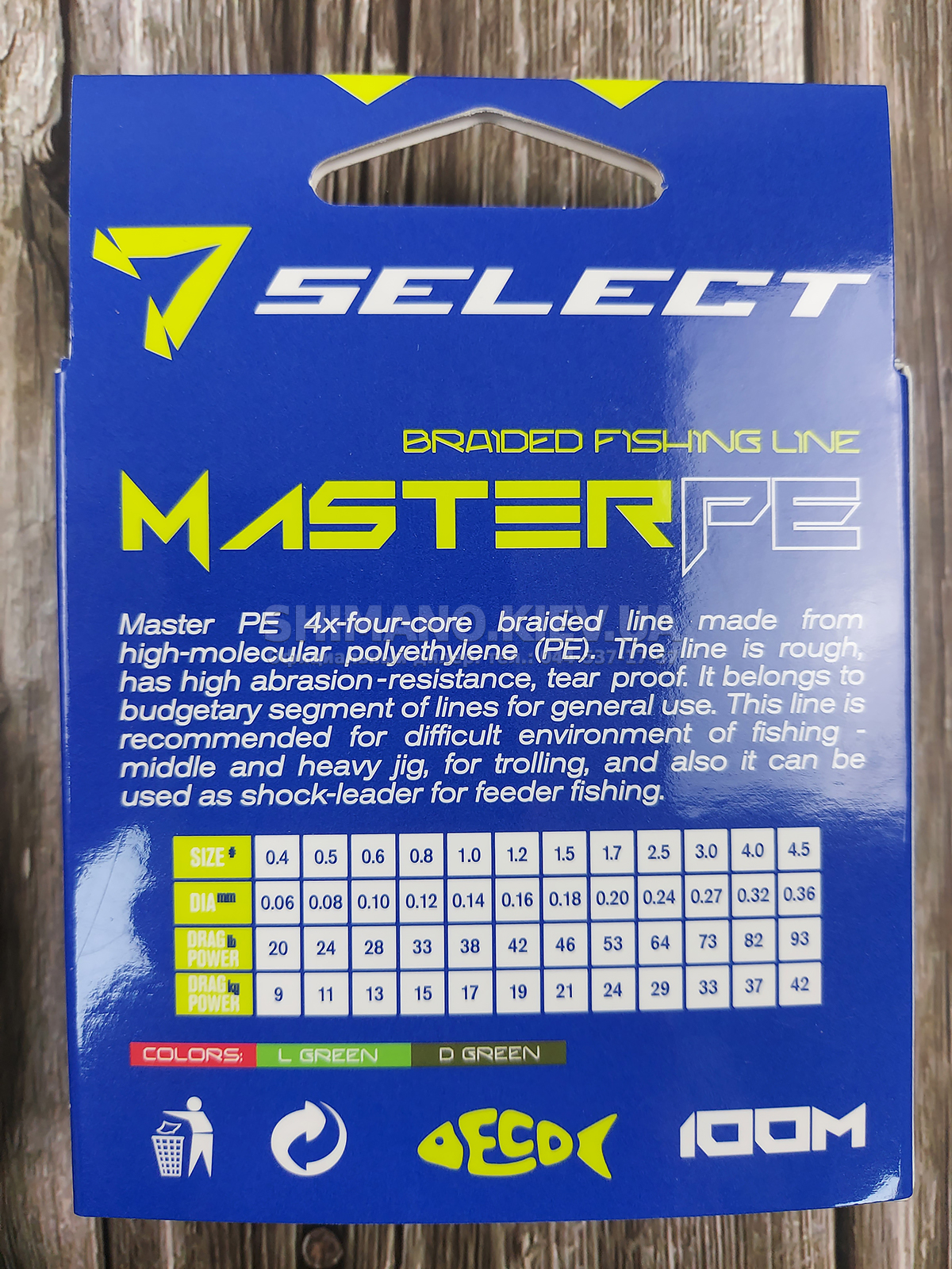 Шнури SELECT Master PE виготовляються з японського матеріалу Nippon Dyneema PE у Тайвані.