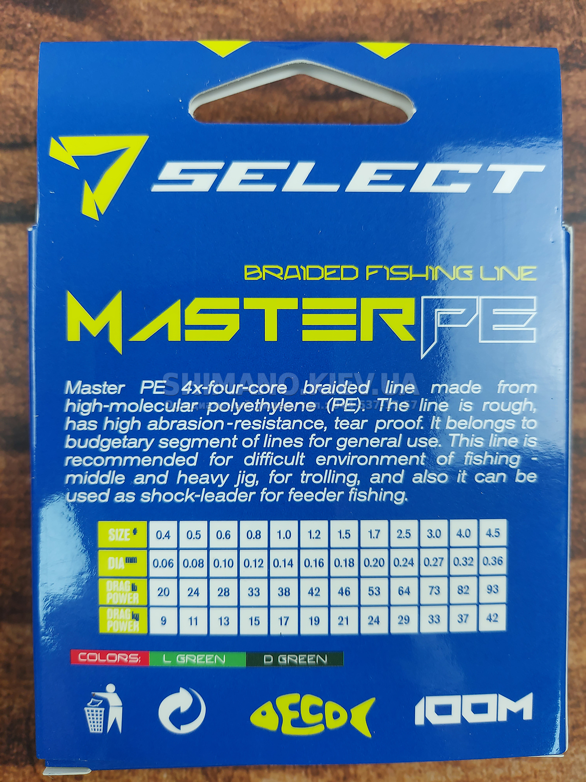 Шнури SELECT Master PE виготовляються з японського матеріалу Nippon Dyneema PE у Тайвані.