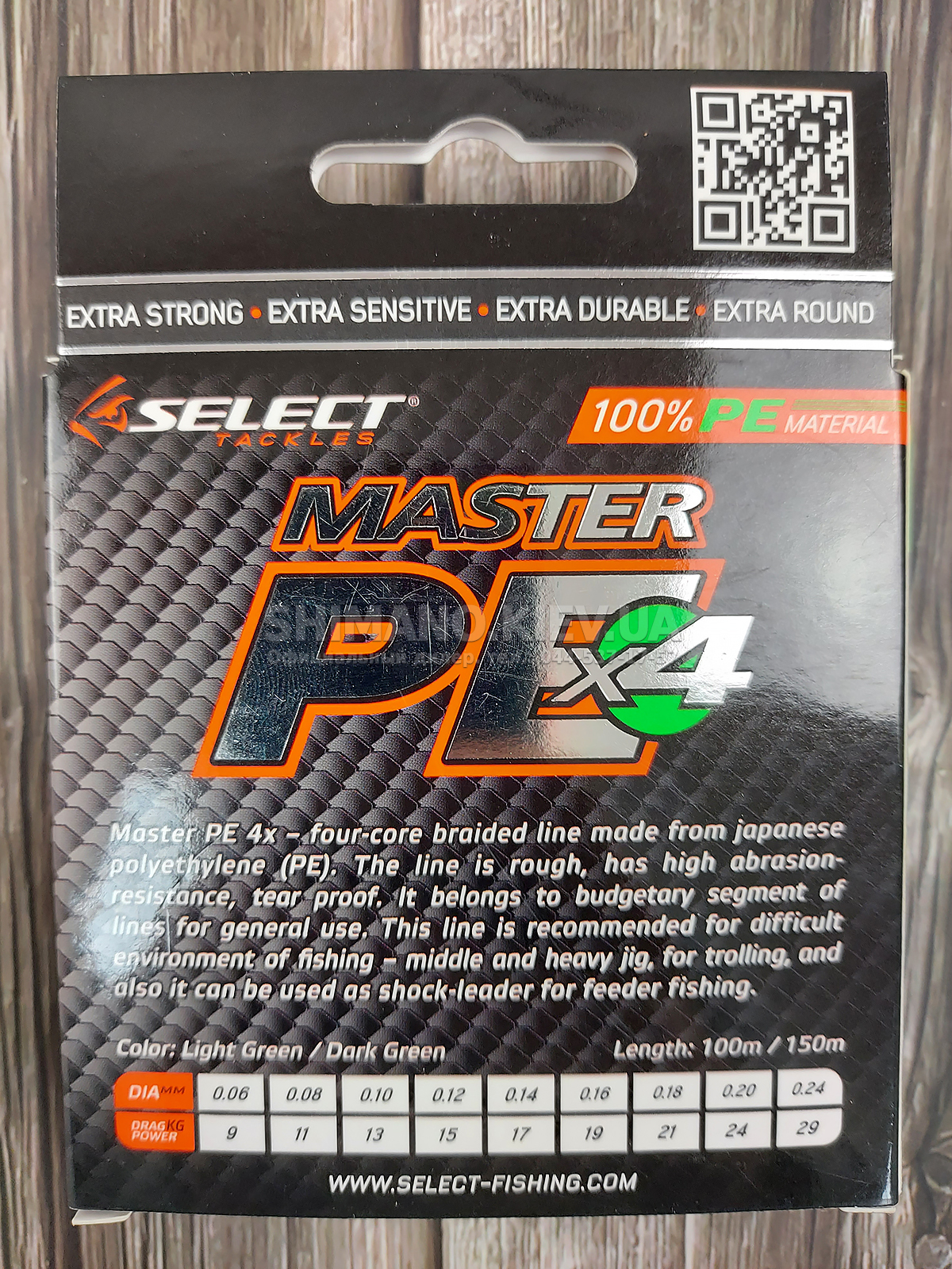 Сучасний 4-жильний шнур SELECT Master PE для всіх типів риболовлі. Шнур Master PE має щільну круглу структуру, високу стійкість до стирання, мінімальну розтяжність та хорошу міцність на вузлі. Завдяки доступній ціні та чудовій якості, шнури SELECT Master PE можуть потягатися з дорожчими аналогами та легко обігрують будь-які бюджетні шнури.